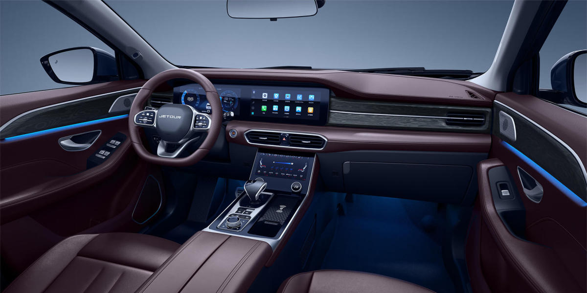 Салон выполнен по корпоративному стандарту Chery: перед водителем расположена панель из двух 12,3-дюймовых дисплеев, под правой рукой — нефиксируемый селектор трансмиссии и сенсорный блок климат-контроля с экраном 9,7 дюйма.