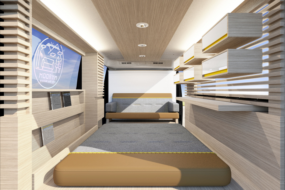 Myroom, еще один концепт на базе Caravan NV 350, – это уже не туристический лагерь, а целая гостиная. В ней нашлось место дивану и двуспальному матрасу, а вдоль стен расположены полки для книг и шкафчики.