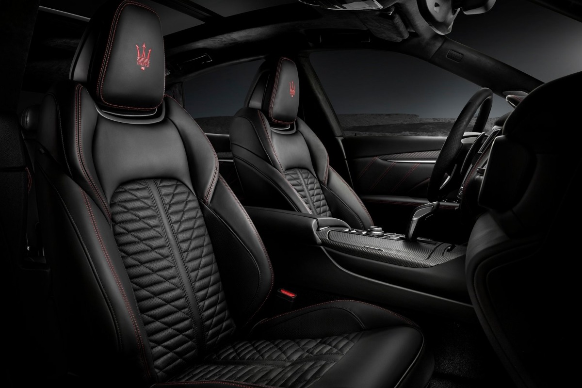 В интерьере нового Levante Trofeo появились обшитые натуральной кожей Pieno Fiore спортивные сиденья с контрастной прострочкой и логотипами «Trofeo» на подголовниках. Кроме того, топовый кроссовер внутри выделяют рельефные металлические накладки на педалях с фирменным «трезубцем», карбоновые декоративные вставки, иной дизайн приборной панели; в стандартную комплектацию автомобиля входит 1280-ваттная аудиосистема Bowers & Wilkins с 17 динамиками.