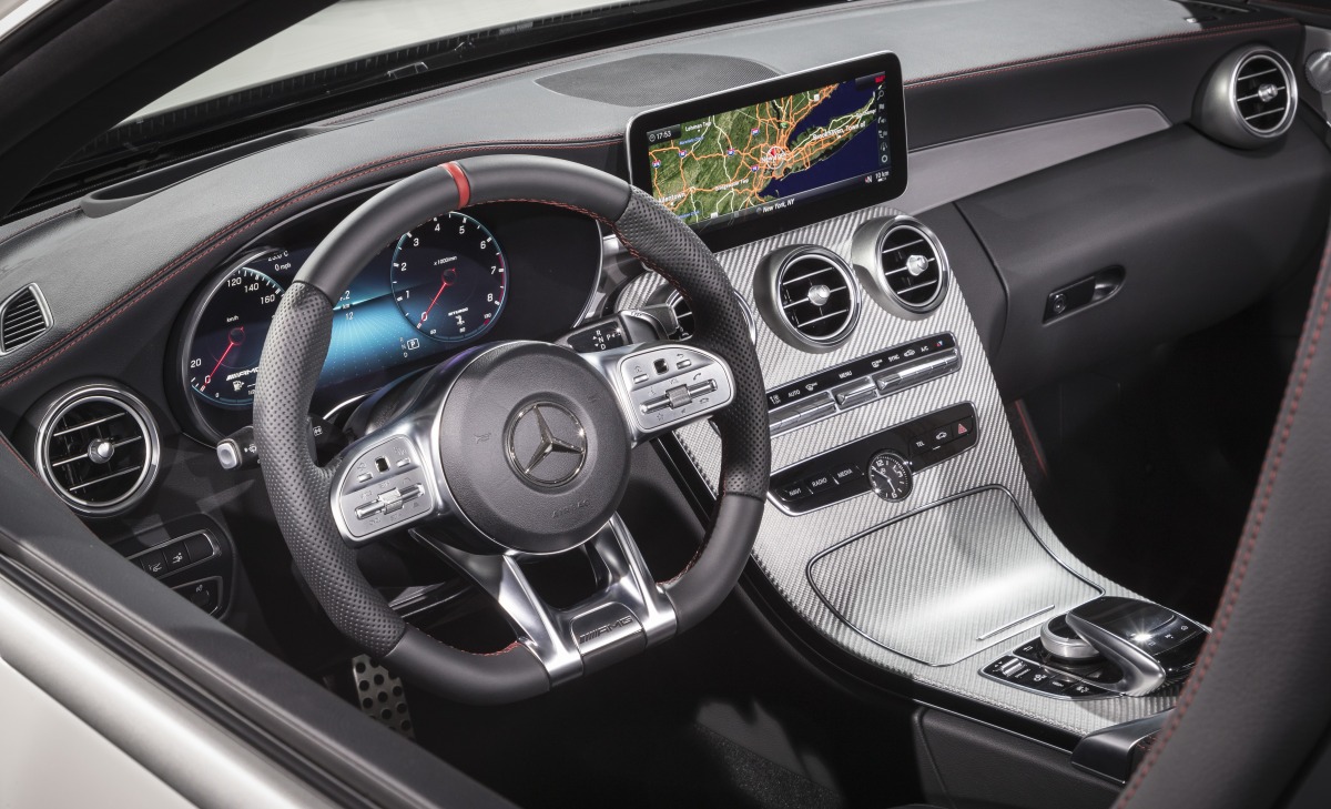 Внутри рестайлинговые автомобили серии C 63 AMG получили полностью цифровую приборную панель на основе дисплея диагональю 12,3 дюйма, два варианта «головного» дисплея мультимедийной системы (на 7 и 10,25 дюйма), новый AMG-руль с тач-пэдами для управления «музыкой» и «мультимедийкой». На выбор покупателю доступны несколько вариантов материалов отделки: под рояльный лак со вставками из алюминия, полированный углепластик и целый ряд сортов натурального дерева.
