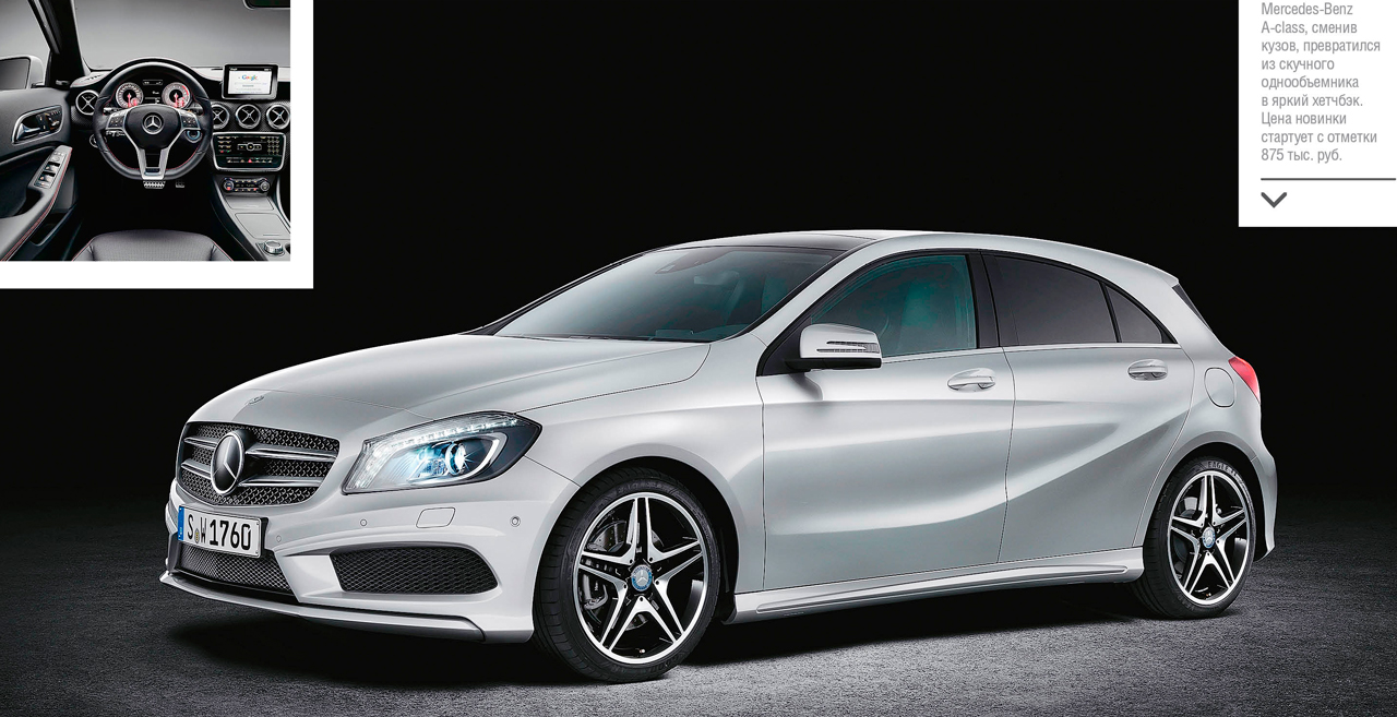 «Мерседес» — мечта любого мальчишки. Но никогда еще эта мечта не была так желанна и доступна, как с появлением нового A-class. Вместе с поколением младшая модель в линейке Mercedes-Benz сменила кузов, превратившись из скучного однообъемника в яркий хетчбэк, при виде которого даже у человека, равнодушного к автомобилям с трехлучевой звездой на эмблеме, может начаться обильное слюноотделение. Особенно если учесть, что цена новинки стартует с отметки 875 тыс. руб. За эти деньги покупатель вправе рассчитывать на мотор мощностью 122 л. с. и «джентльменский» набор опций, включая системы, контролирующие массу параметров — от курсовой устойчивости автомобиля и давления в шинах до освещенности дороги и самочувствия водителя. Также здесь будет кондиционер, аудиосистема с USB и электропакет.