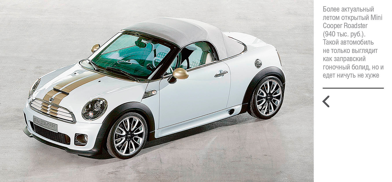Но если хочется получить больше драйва, стоит обратить внимание на продукцию дочернего подразделения BMW, коим является легендарный британский бренд Mini. Автомобили этой марки также относятся к премиальному сегменту, что отражается на их цене: самый доступный Mini One обойдется в 730 тыс. руб., но за более «горячие» версии придется отдать больше миллиона. Учитывая, что Mini — машина для водителя, а не для пассажира, покупателю стоит проявить максимальный эгоизм и выбрать двухместный Cooper Coupe (от 880 тыс. руб.) или более актуальный летом открытый Cooper Roadster (940 тыс. руб.). Такой автомобиль не только выглядит как заправский гоночный болид, но и едет не хуже. Эта модель похожа на карт, но пригодный для езды по дорогам общего пользования, который даже со «стоковым» 122-сильным мотором способен накачать водителя изрядной порцией адреналина.
