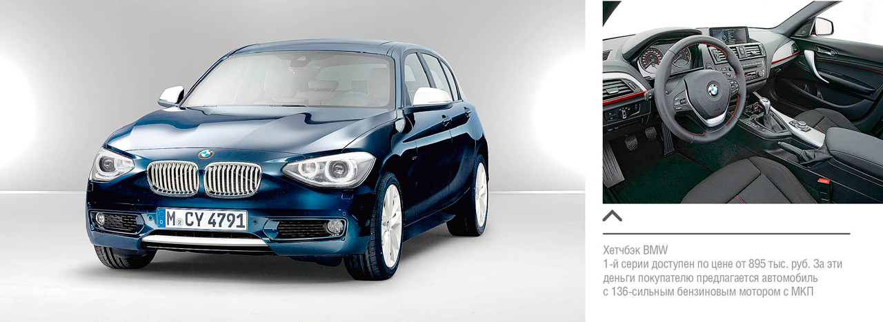 Не менее заманчивое ценовое предложение россиянам делает другой производитель из Баварии — компания BMW. Хетчбэк 1-й серии доступен по цене от 895 тыс. руб. За эти деньги покупателю предлагается автомобиль с 136-сильным бензиновым мотором с МКП (наличие АКП увеличивает цену сразу на 85 тыс. руб.) и хорошим оснащением. Автомобиль по умолчанию комплектуется шестью подушками безопасности, системой курсовой устойчивости, противотуманками, кондиционером, «музыкой», подогревом зеркал и передних сидений, бортовым компьютером, кнопкой запуска мотора и даже не боящимися проколов шинами. При этом «баварец» имеет такое уникальное отличие от одноклассников, как задний привод, который в руках умелого пилота способен превратить семейный хетчбэк в настоящий спорткар!