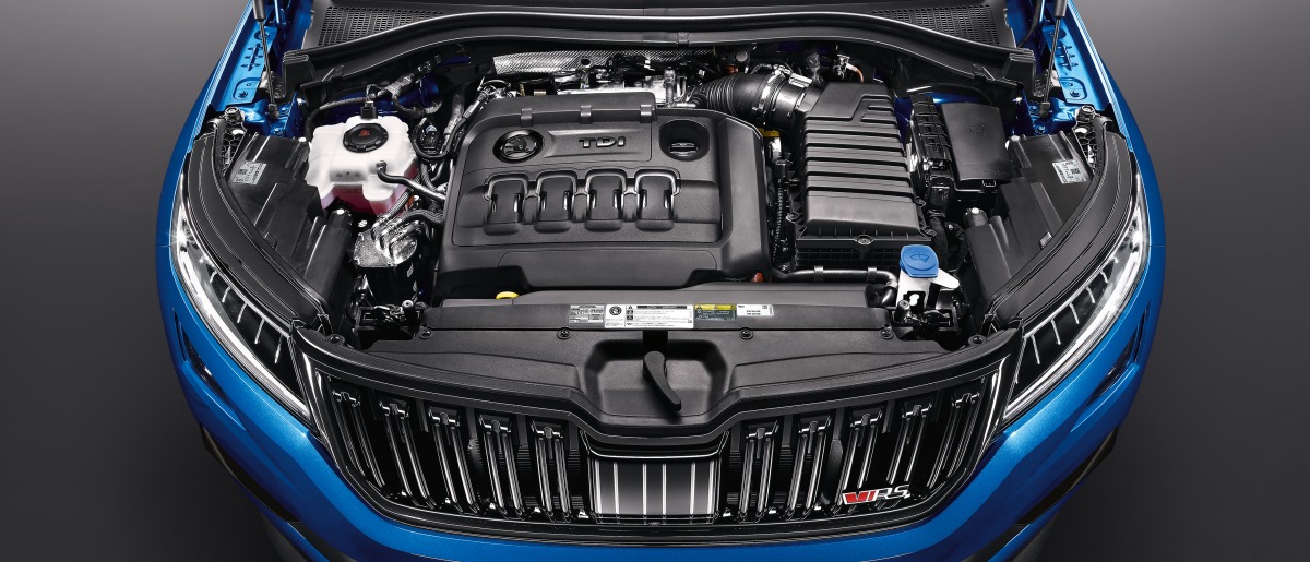Под капотом нового Kodiaq RS – 2,0-литровый битурбодизель, развивающий мощность 240 л. с. и максимальный крутящий момент 500 Нм. На пик тяги двигатель выходит при 1750 – 2500 об/мин. Мотор работает в паре с 7-ступенчатой коробкой DSG, на колеса крутящий момент передается посредством полноприводной трансмиссией на основе многодисковой муфты с электронным управлением и электронной же блокировкой дифференциала. Система перераспределяет крутящий момент по осям и может «перебросить» до 85% тяги на каждое из колес или работать исключительно в переднеприводном режиме.