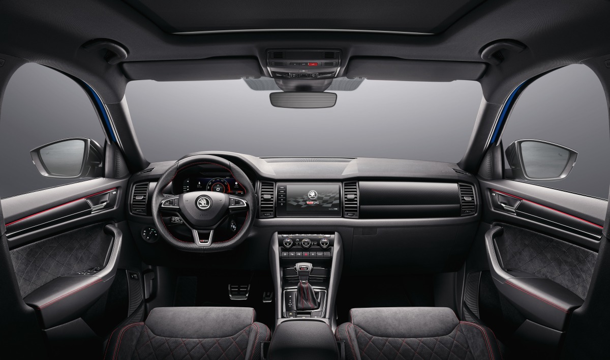 Интерьер нового Kodiaq RS отделан в спортивном стиле; передние сиденья уже в стандартной комплектации – спортивные с интегрированными подголовниками. Спинки и подушки кресел обшиты перфорированной алькантарой, боковые части – кожей. Сиденья, кожаный спортивный руль, чехол рычага коробки передач и подлокотники прострочены красной нитью.