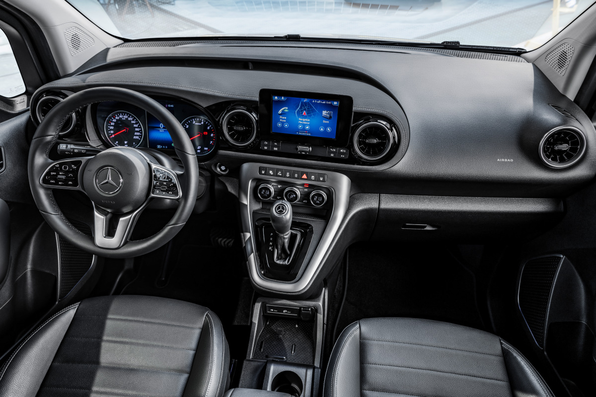 По умолчанию салон обит тканью, а за доплату предложена отделка кожзамом Artico. Натуральная кожа T-классу не доступна даже в качестве опции, как и панорамная крыша или полностью цифровая приборная панель. Кресло переднего пассажира в простых версиях не регулируется по высоте, также придется доплачивать за электростеклоподъемники на сдвижной двери. Как и Citan, его «премиальный» аналог оснащен 7 подушками безопасности, а в качестве опции покупателям предложат активный круиз-контроль, парктроники с камерой заднего вида, спутниковую навигацию и систему помощи при езде с прицепом.