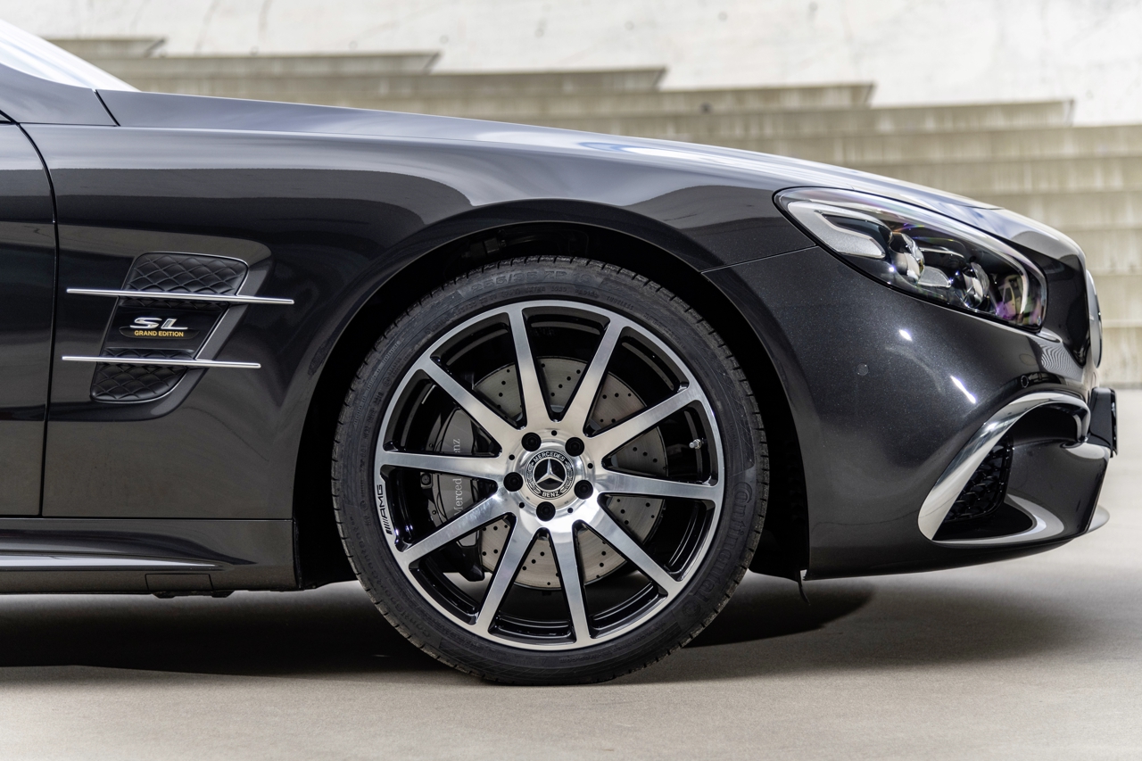 SL Grand Edition получил спортивную подвеску, глянцевые кованые диски AMG с 10 спицами диаметром 19 дюймов см спереди и 20 дюймов см сзади, а также значки с логотипом новой серии.