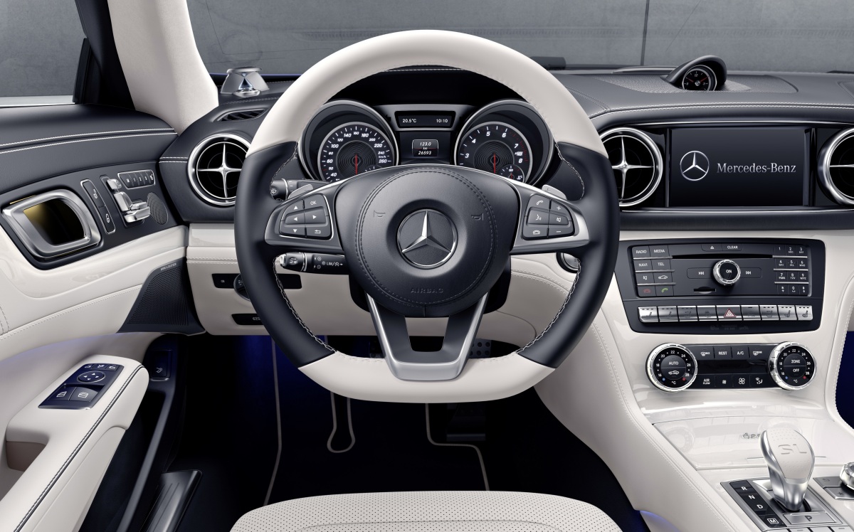 Салон нового SL Designo Edition отделан с широким применением кожи Nappa. Причем преобладающими цветами в отделке стали черный и кремовый.