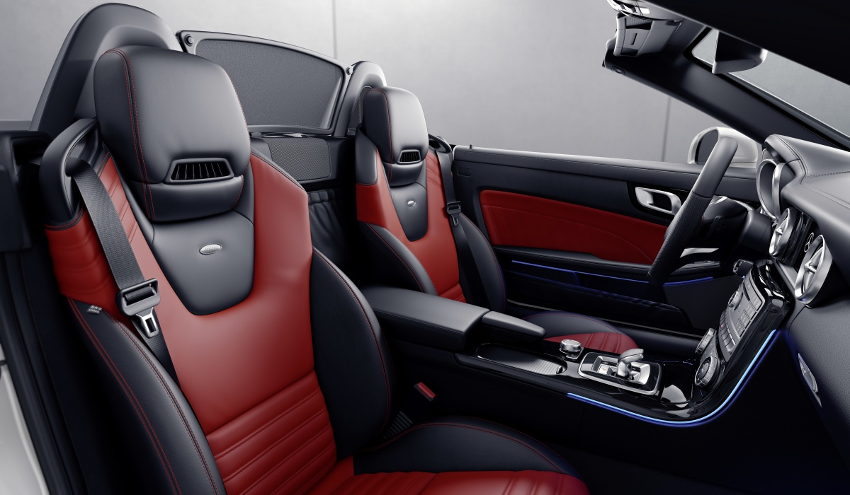 Внутри SLC RedArt Edition отделан с применением кожи Nappa контрастных цветов: черного и красного; на подголовниках вышит логотип спецсерии. Родстер в особом издании серийно оснащается системой Airscarf, которая подает теплый воздух в район шеи водителя и пассажира.