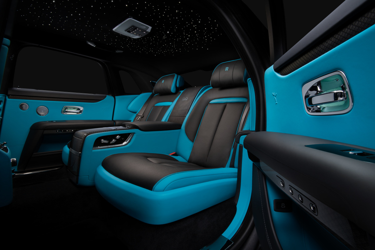В салоне свободы выбора меньше. Для отделки эксклюзивных «Роллс-Ройсов» использована бирюзовая кожа Turchese в сочетании с карбоновыми вставками. На передней панели отображается символ бесконечности – отличительная черта Black Badge. Цветовой мотив повторяется в дизайне 21-дюймовых колесных дисков, которые тоже частично выполнены из углеволокна.