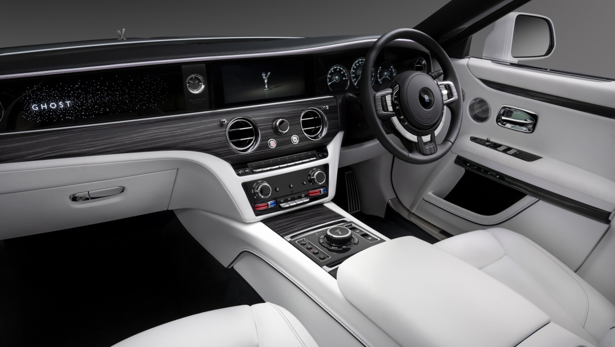 Внутри новый Ghost оформлен в фирменном «роллс-ройсовском» стиле, на передней панели размещена светящаяся надпись с названием модели в окружении 850 «сияющих» звезд. Двери автомобиля открываются и закрываются автоматически; покупателям доступны проекционный дисплей высокого разрешения, система обнаружения пешеходов в темное время суток, камеры кругового обзора, а также аудиосистема выходной мощностью 1300 Вт с 18 динамиками.