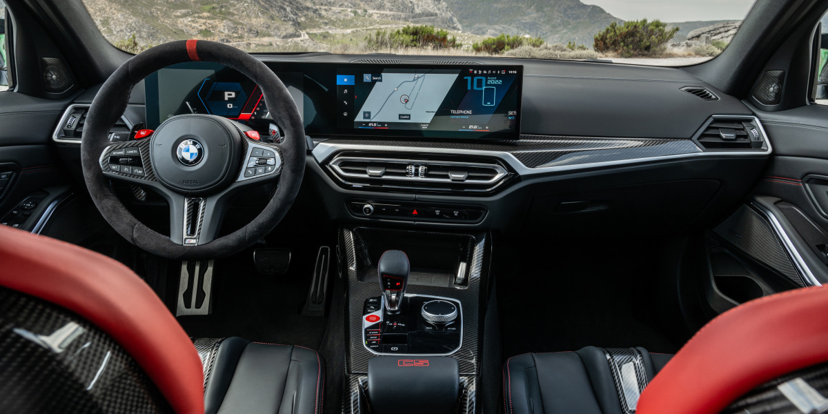 Интерьер M3 CS выполнен в черно-красной гамме, а руль обит замшеобразным волокном. Если у M4 CSL еще старая компоновка дисплеев приборной панели и мультимедийной системы, то в новой M3 CS уже установлена панель из сдвоенных экранов, которая появилась на всех рестайлинговых 3 Series. Конечно, с трековыми режимами M Drive Professional, но за проекционный дисплей (он доступен в составе опции BMW Live Cockpit Professional) нужно доплатить еще 1150 евро.