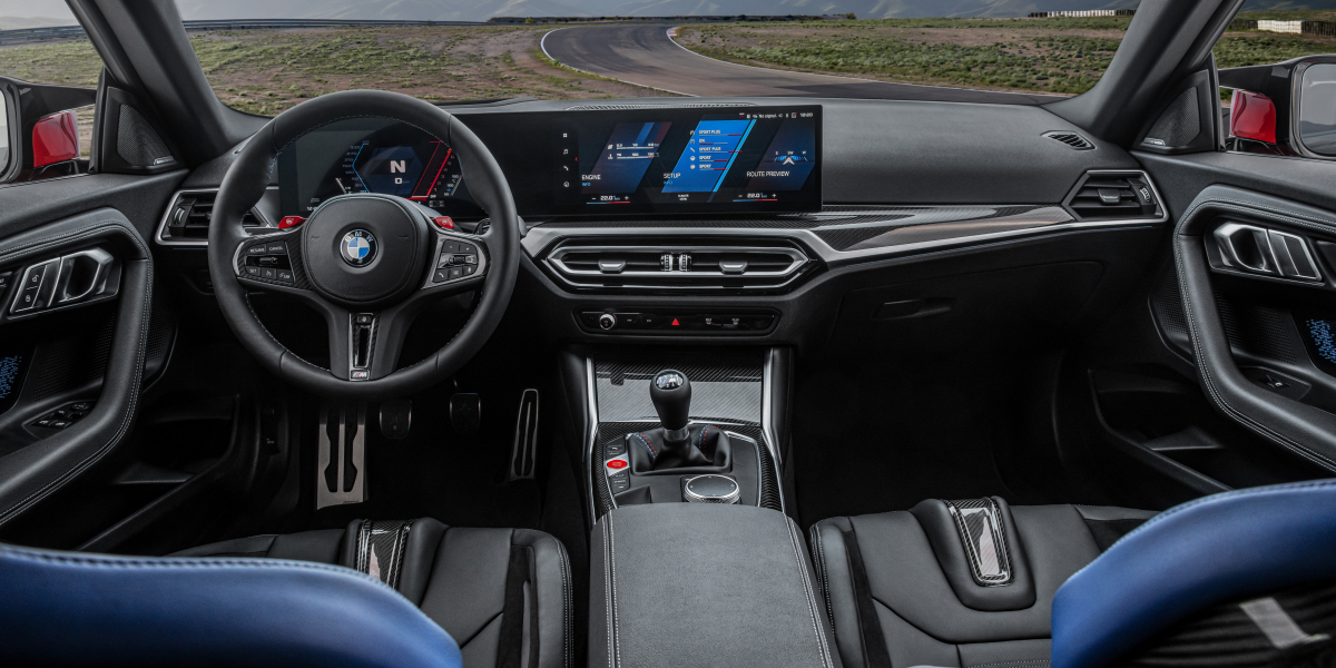 Салон новой M2 идентичен убранству M240i – за исключением нового руля от старших «эмок» с красными кнопками M1 и M2, к которым можно привязать пользовательские ездовые режимы. Базовые кресла имеют «гражданский» профиль, а в качестве опции предложены сиденья с цельным подголовником или карбоновые «ковши», которые облегчат машину на 10,8 кг. Натуральная кожа Vernasca и карбоновые декоративные вставки тоже вошли в список опций, как и проекционный дисплей. Перед водителем расположена изогнутая панель из двух дисплеев в стиле всех без исключения новых BMW: 12,3-дюймовой «приборки» (с фирменной M-графикой) и 14,9-дюймового тачскрина мультимедийной системы.