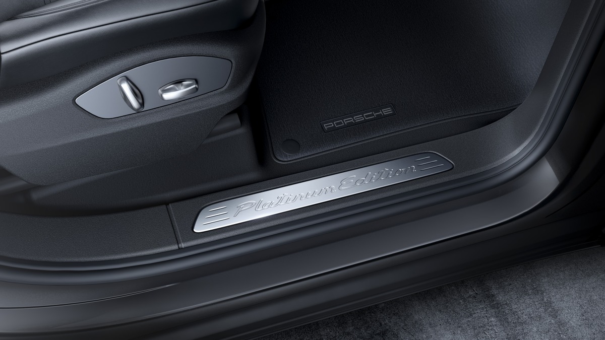 Внутри автомобиль оснащен спортивными кожаными сиденьями с электрорегулировкой по восьми направлениям, обивкой центральной части из алькантары и гербами Porsche на подголовниках. Пороги отделаны накладками из нержавеющей стали с надписью Platinum Edition. В переднюю панель «врезаны» аналоговые часы.