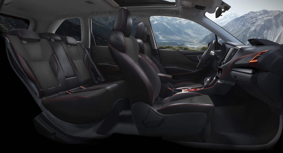 Оранжевые вставки украшают также интерьер автомобиля; двери и сиденья «спортивного» Forester обшиты материалом с водоотталкивающим покрытием; багажное отделение и задняя дверь получили светодиодную подсветку.