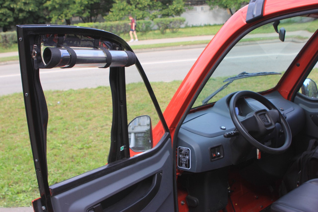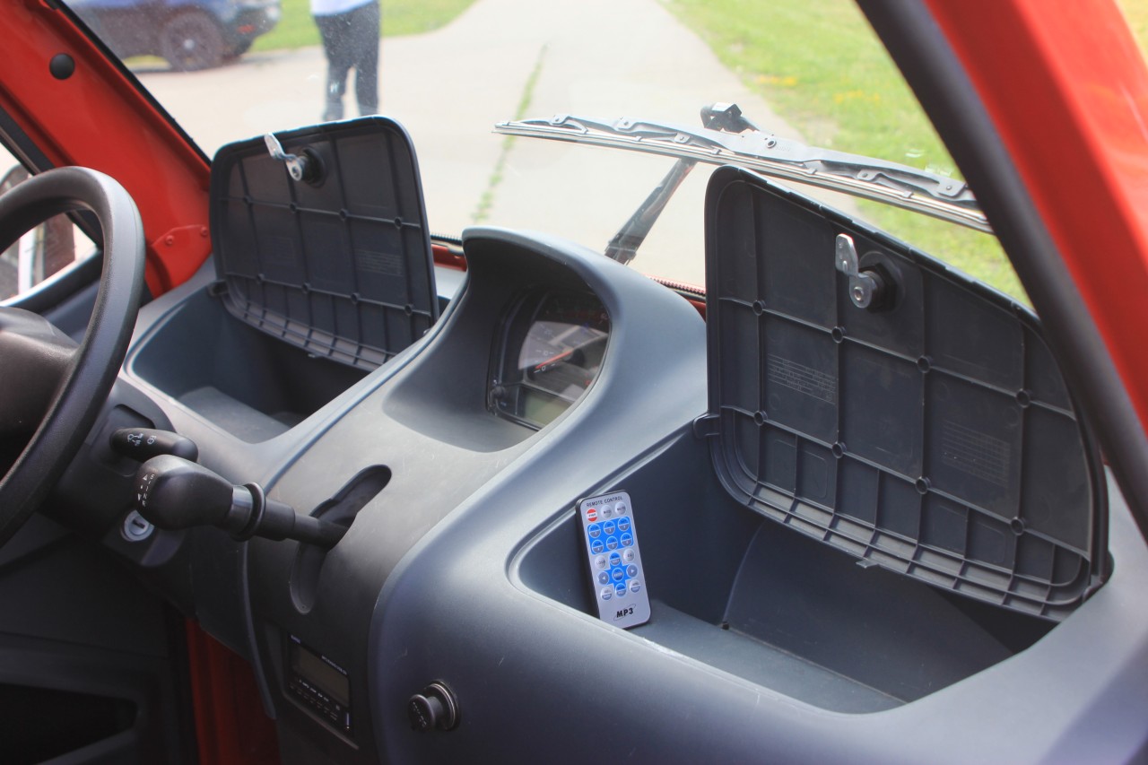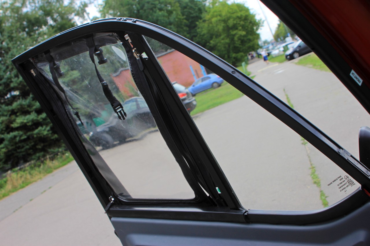 Начнём с того, что у машины нет ни привычных окон, ни замков на дверях. На ключ запирается всё – багажник спереди, лючок бензобака, бардачки в салоне, но не двери! Закрыть машину можно, просунув руку через… виниловые окна на молниях, пришитых к двери. Их же можно смотать в рулон.