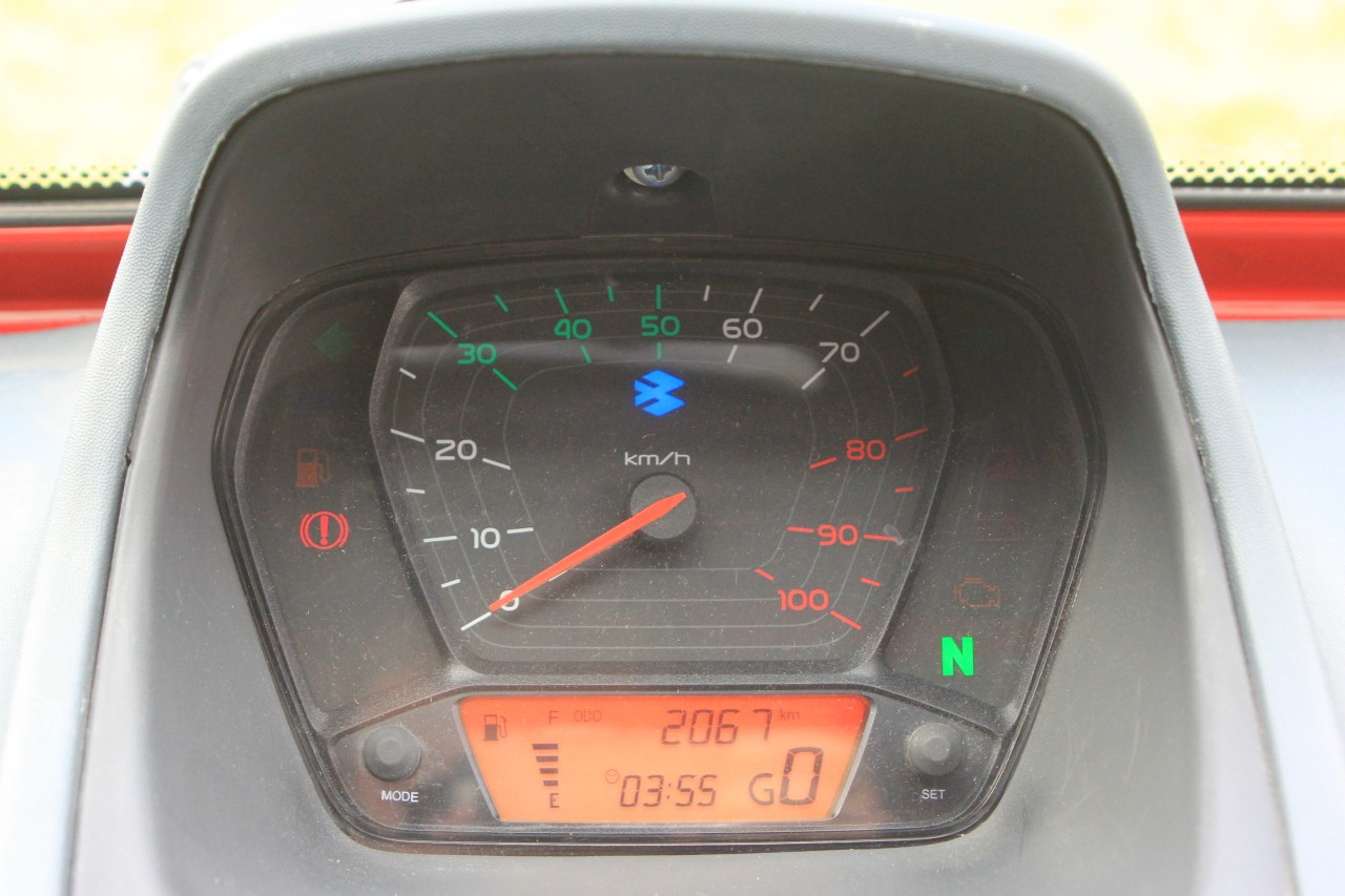 На ней мотоциклетный щиток приборов, рычаг «механики», два бардачка и микромагнитолка, имеющая даже пульт ДУ и умеющая, на удивление, проигрывать музыку с USB-носителей и microSD-карт. Под ней со стороны правого пассажира – внимание! – полноразмерное запасное колесо с домкратом.