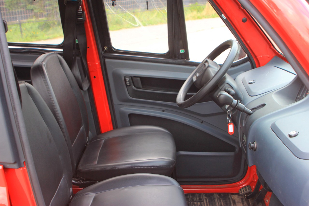 С запасом пространства по ногам и голове нет никаких проблем – даже сзади свободно. По ширине, само собой, есть – двое взрослых сидят рядом почти в обнимку, благо по коммерческой задумке пассажиров в машине особо не предвидится. Что касается самой посадки за рулём, то она терпимая. Беда только с обзором по бокам и назад – свернутое в трубочку окно, оказывается ровно напротив глаз, а в боковые микрозеркала мало что видно. Зато вперед видно всё.