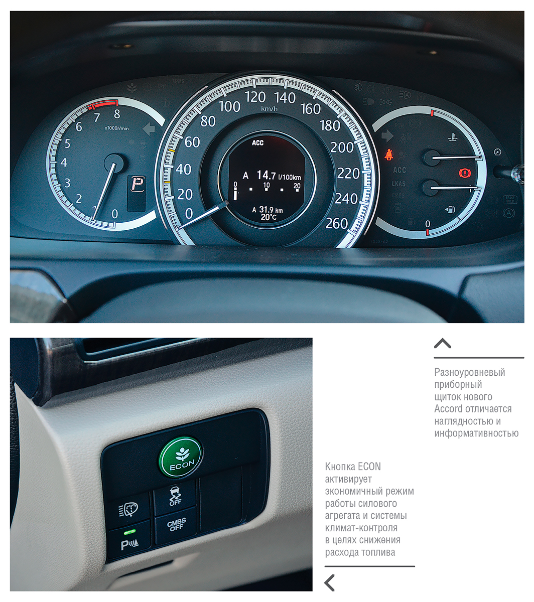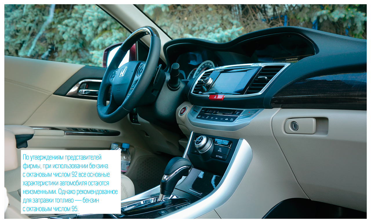 В стремлении сделать Accord безоговорочным лидером своего сегмента дизайнеры предложили новый интерьер, равного которому не имело ни одно поколение модели. Просторный салон, под стать солидным современным апартаментам; мощный и эффективный двухзонный климат-контроль, весьма совершенные приборы и эргономичные органы управления превращают езду в удовольствие. Причем как для сидящего за рулем, так и для пассажиров. Ложкой дегтя в бочке меда можно назвать короткий центральный подлокотник, который не позволяет одновременно и облокачиваться, и рулить. А универсальные широкие сиденья, рассчитанные на людей различной комплекции, скорее особенность японского седана, чем его недостаток. Салон нового Accord стал значительно просторнее. Особенно заметно увеличение внутреннего пространства в районе ног задних пассажиров (+85 мм в сравнении с предыдущей моделью), также вырос объем багажника и составляет 495 литров (+28 литров). Его функциональность можно увеличить, откинув спинку заднего сиденья.