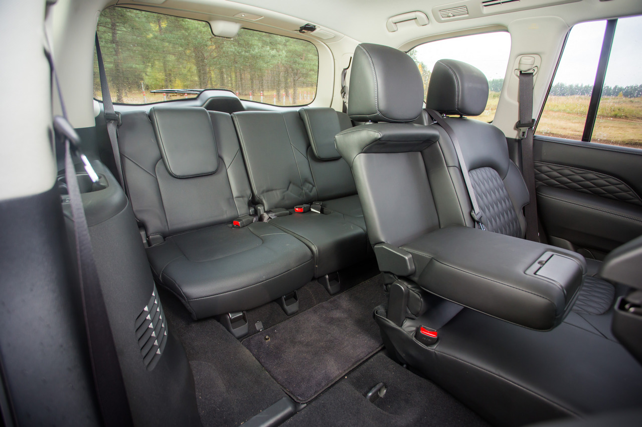 Нажатие кнопки — и электроприводы поднимают из багажника третий ряд сидений, который может вместить... трех человек. То есть Infiniti QX80 официально восьмиместный. Правда, стоит понимать, что троица эта должна быть желательно из балетной труппы. На самом деле главным недостатком третьего ряда является высокий пол и невозможность чуть-чуть сдвинуть вперед центральный диван: по ширине и высоте места с избытком, а вот ноги приходится задирать.