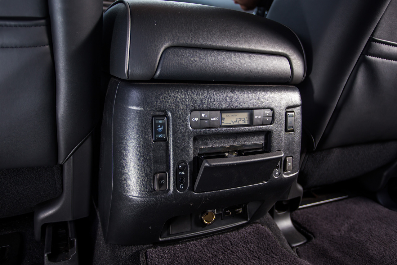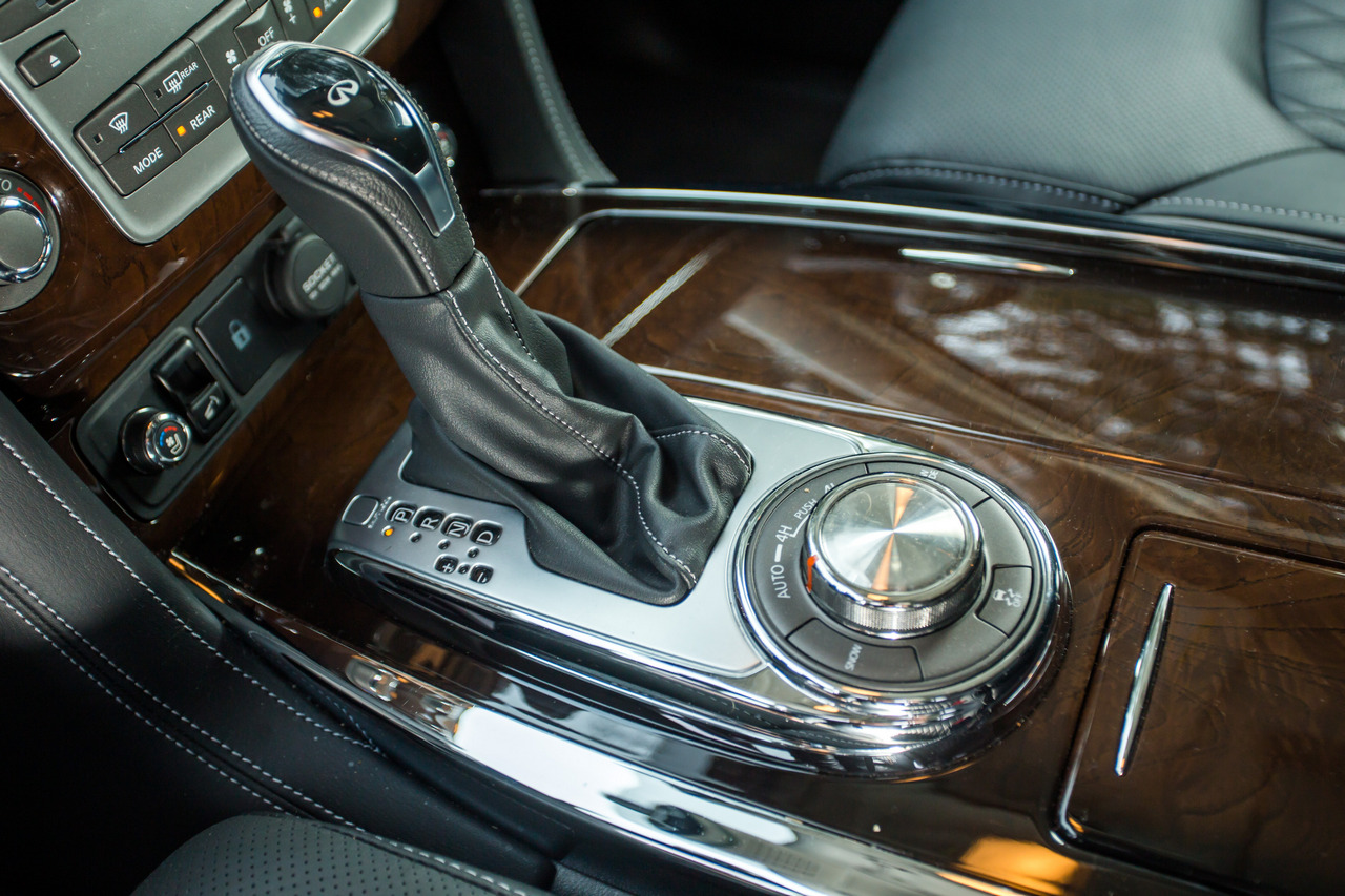 Задний диван — отсек бизнес-класса, хоть и регулируется механически. За доплату можно заказать два отдельных кресла с тумбой. У пассажиров собственный блок старомодного климат-контроля, подогрев сидений, USB-розетки и собственная мультимедийная система с HDMI-выходом, мониторами и парой наушников. За возможность стряхнуть пыль с домашней коллекции компакт-дисков Infiniti отдельное спасибо.