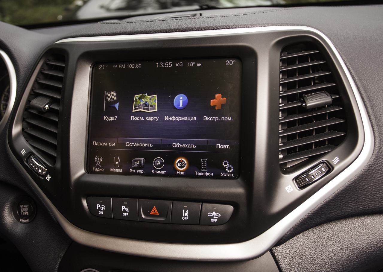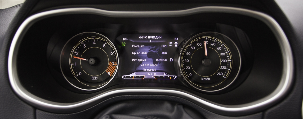 Мультимедийная система UConnect радует и качеством картинки, и текстурами оформления, и быстротой работы. Только в навигации ввод адреса назначения придется каждый раз набирать целиком – система не отсеивает значения по первым буквам. Само собой, имеются USB-порты и слоты для карт памяти. В таком же приятном глазу оформлении выводится масса информации и на дисплей щитка приборов.