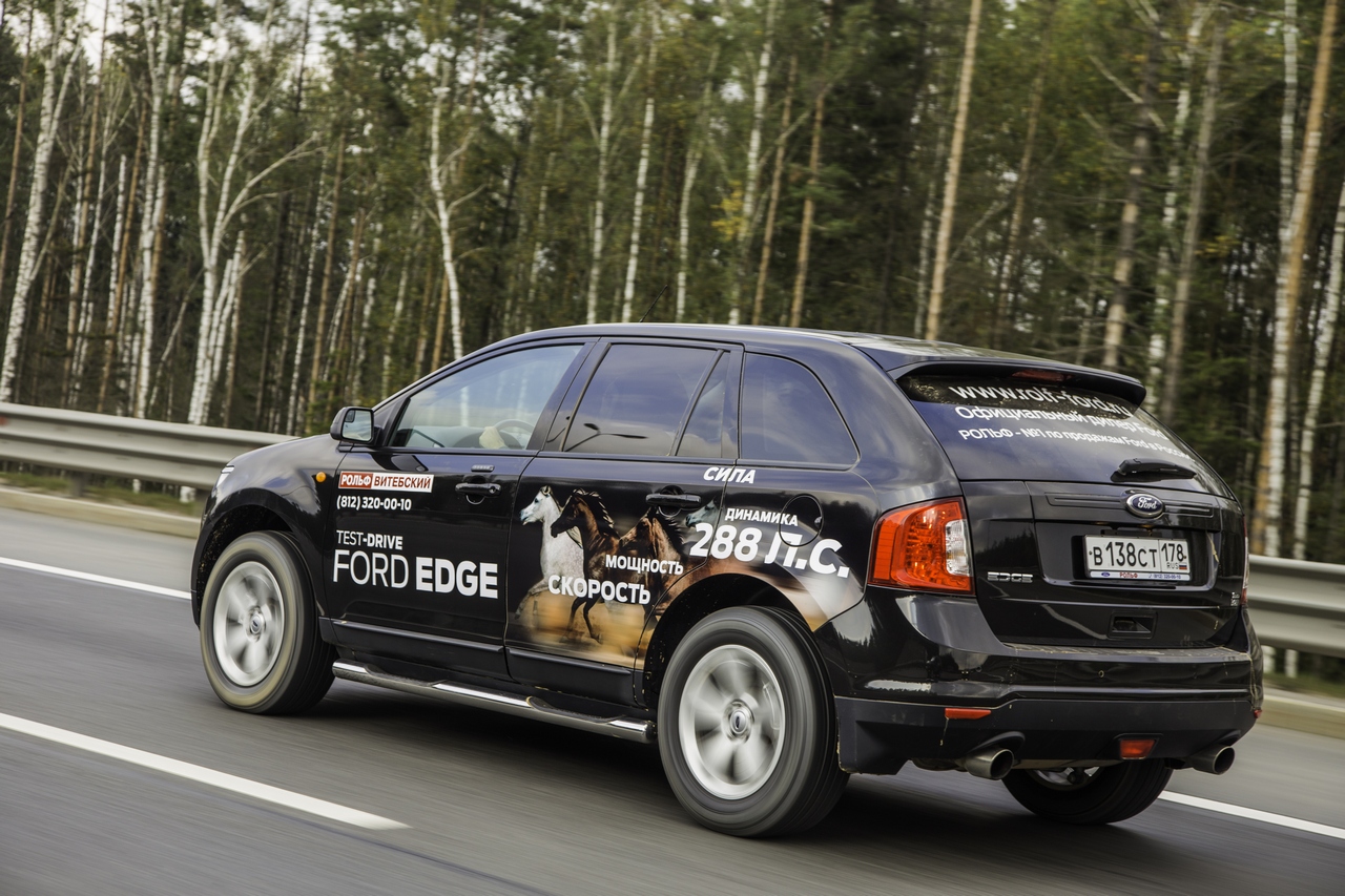 У Ford Edge, благодаря всё тому же удачно скомпонованному кузову и габаритам, багажник получился огромным – 911 литров. А при сложенных сиденьях машину можно считать развозным фургоном – почти два куба пространства. Есть и розетка на 12 вольт, и пара крючков, и даже кнопка отщелкивания фиксаторов спинок задних кресел. Удивляет Эдж только одним – отсутствием багажной полки. Не предусмотрена конструкцией. Как так?