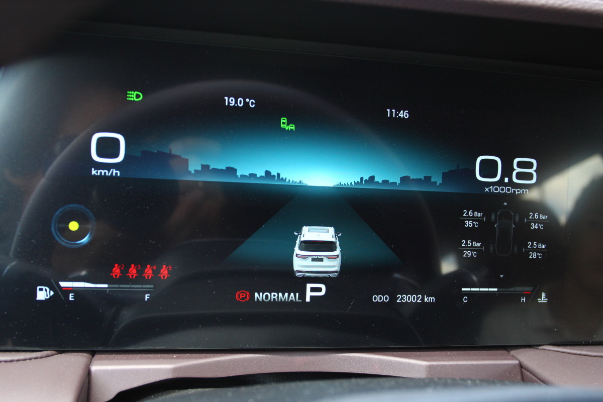 Всего экранов у X90 Plus три: помимо уже упомянутого дисплея климат-контроля, это полностью цифровая приборная панель и дисплей мультимедийной системы. Меньше всего вопросов возникло к «приборке»: дисплей — яркий и контрастный, информация считывается быстро. Хотя «инфографика» с постоянно движущимся автомобилем в центре и индикацией работы систем помощи водителю — решение на любителя. Два других экрана, как выяснилось, склонны бликовать при ярком боковом свете, а «климатический» оказался к тому же заядлым «пылесборником».