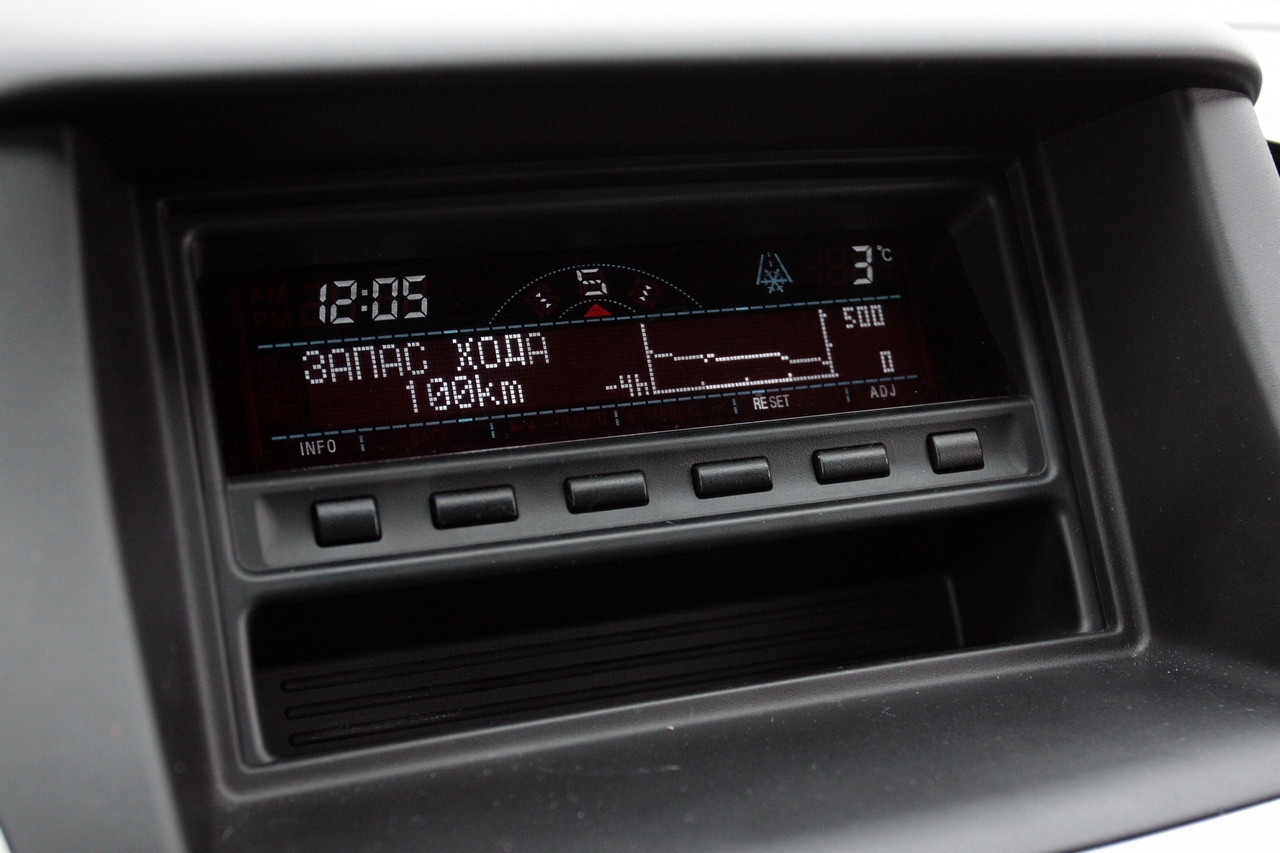 Но это лишь первые впечатления. Попривыкнув, начинаешь отмечать, что различий с любой легковушкой тут не так и много, хотя все они словно родом из прошлого. Вот большой щиток приборов с цифровым одометром, но «ламповым» отображением режимов полного привода. Вот классическая однодиновая магнитола без USB-порта, вот большие «крутилки» простенького однозонного «климата», а вот и экранчик бортового компьютера с графикой конца 80-х годов прошлого века.
