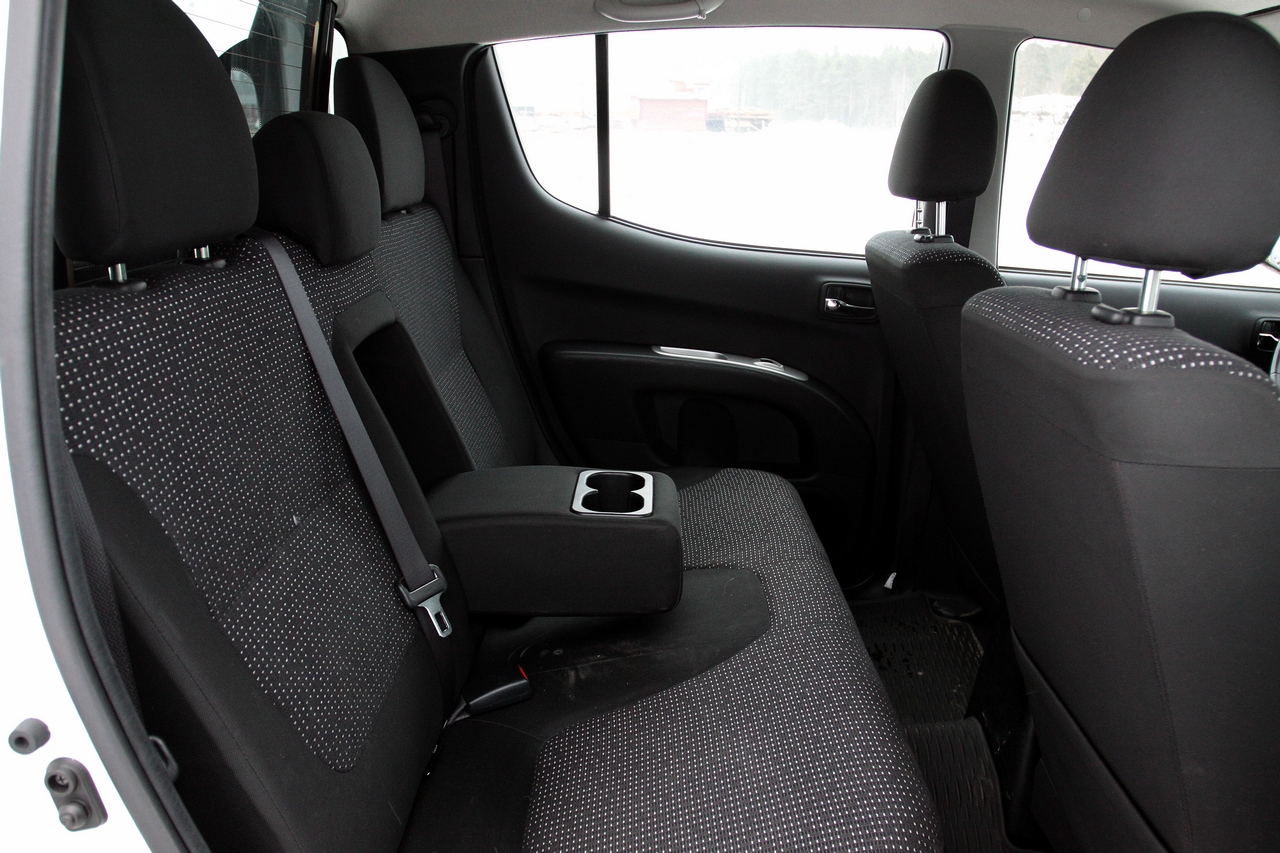 Позаботились японцы о задних пассажирах, что в классе пикапов – редкость. Запас пространства достаточный, есть удобный подлокотник с подстаканниками и карманы в дверях. А главное – увеличенный угол наклона спинки дивана, позволяющий принять более расслабленную и удобную посадку. Правда, в отличие от многих конкурентов, нет никакой дополнительной трансформации дивана под грузовые нужды. За не полностью откидывающейся спинкой лишь набор инструментов.