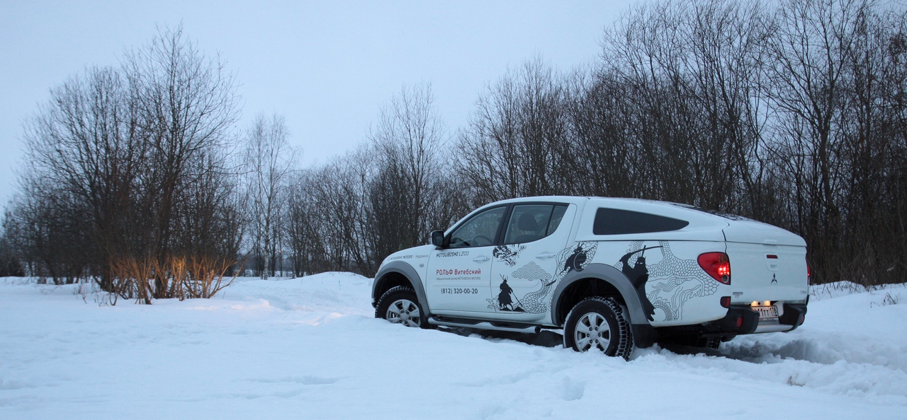 Первые же заезды по «дикой» раскатанной трактором колее в обход деревни показали, что для Mitsubishi L200 это вообще не препятствие – хватает простого подключения передка. Так что, недолго думая, мы отправили пикап в снежную целину.