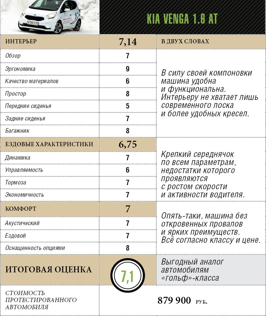 И вот тут-то и выяснятся, что стратегически у собираемого у нас Kia Venga в рукаве притаился главный козырь – крайне привлекательная стоимость. После взлетевших до небес цен Venga осталась в докризисном диапазоне семисот-восьмисот тысяч рублей, а в максимальной комплектации – дешевле девятисот. Получается, что корейский компактвэн выгоднее любой современной машины «гольф»-класса в схожем оснащении, учитывая, что он просторнее и функциональнее по салону, при этом не особо проигрывает по остальным характеристикам.