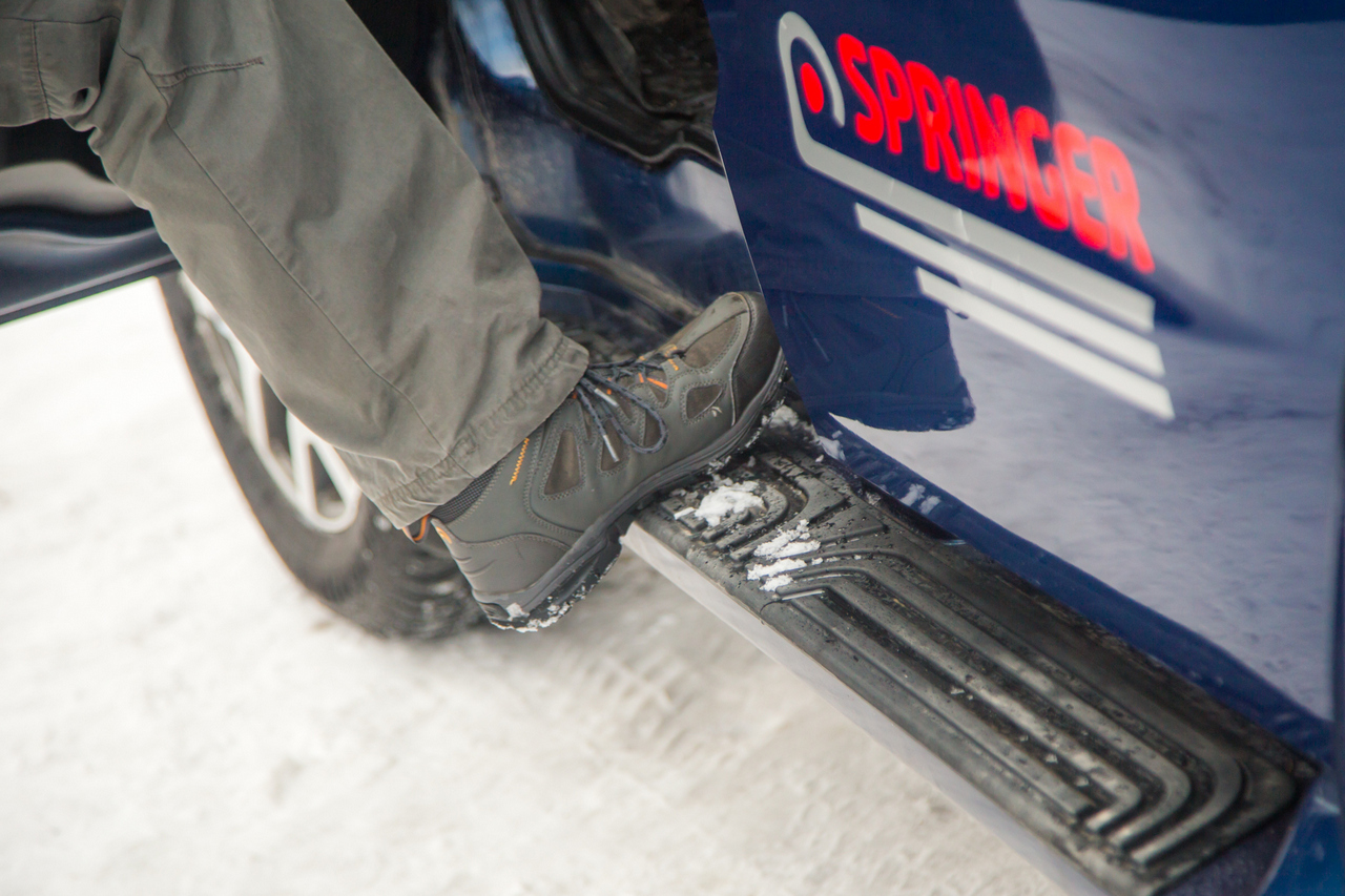 Пороги и поручни — не элементы внедорожного тюнинга, а реальная необходимость, особенно для невысоких пассажиров: над землей кабина возвышается на добрые полметра
