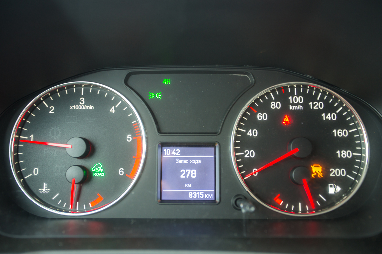 Картинка с камеры заднего вида на треть перекрыта висящим на багажной двери запасным колесом. Бортовой компьютер не показывает ни среднего, ни мгновенного расхода топлива, а положение индикатора остатка топлива зависит от наклона кузова машины, благо трясущиеся стрелки на щитке приборов остались в далеком прошлом.