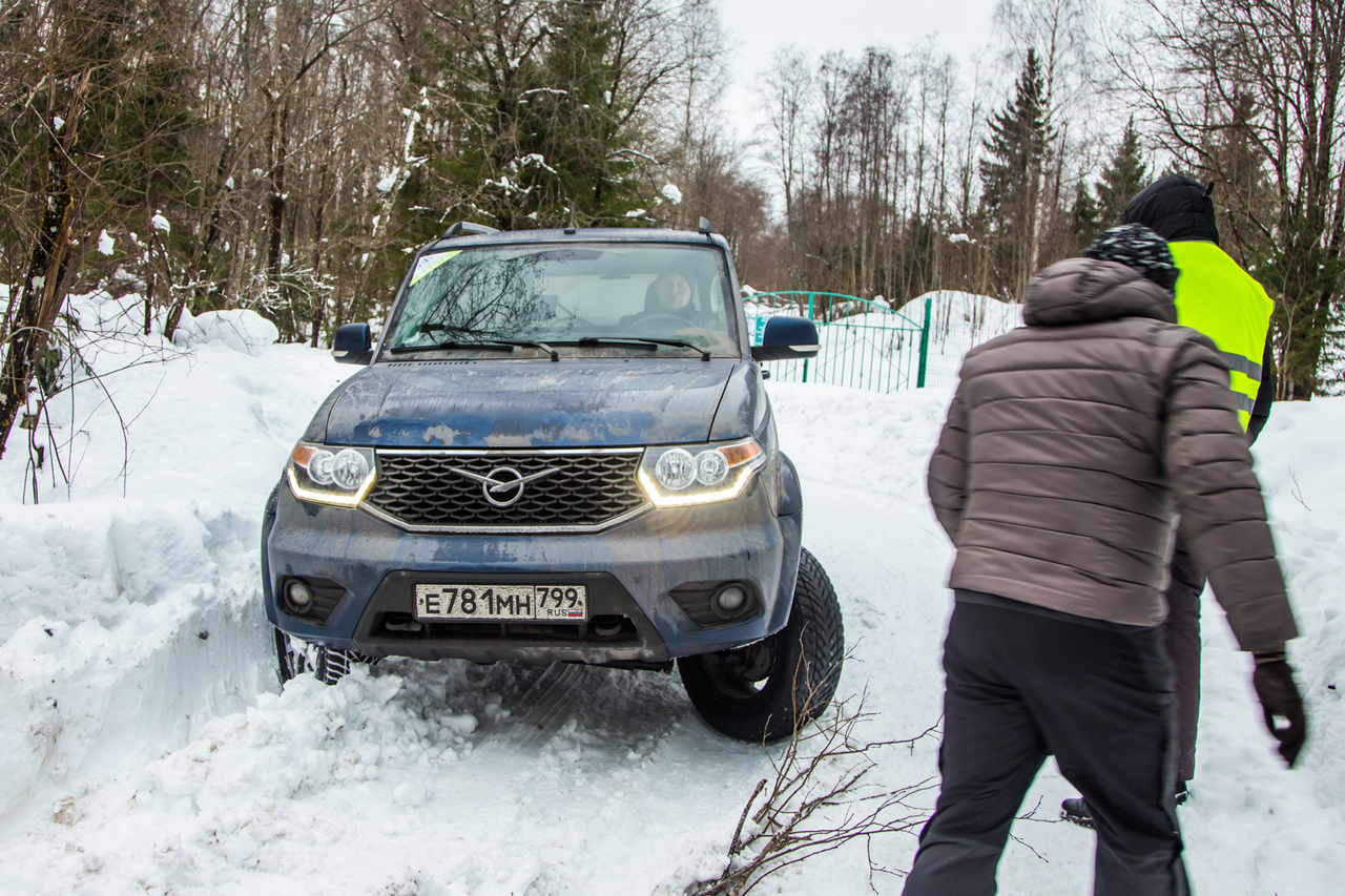 К чему это? Да к тому, что для привлечения «городской» аудитории «Патриот» на зиму обули во фрикционные покрышки Goodyear, на которых он потерял половину своего почти безлимитного внедорожного потенциала. Мощная система Part-Time, понижающая передача и блокировка заднего дифференциала оказались беспомощными, когда машина правой стороной провалилась в овраг с рыхлым снегом. Три минуты раскачки вперед-назад — и под нешипованными колесами гладенький каток: хоть цепи доставай. А на чисто заднем приводе внедорожник не всегда был способен просто заехать на ровную укатанную горку.