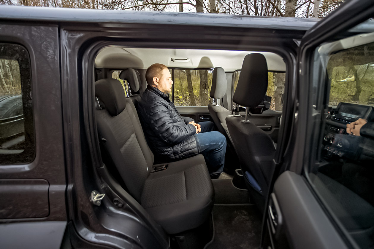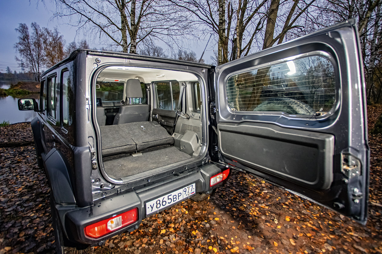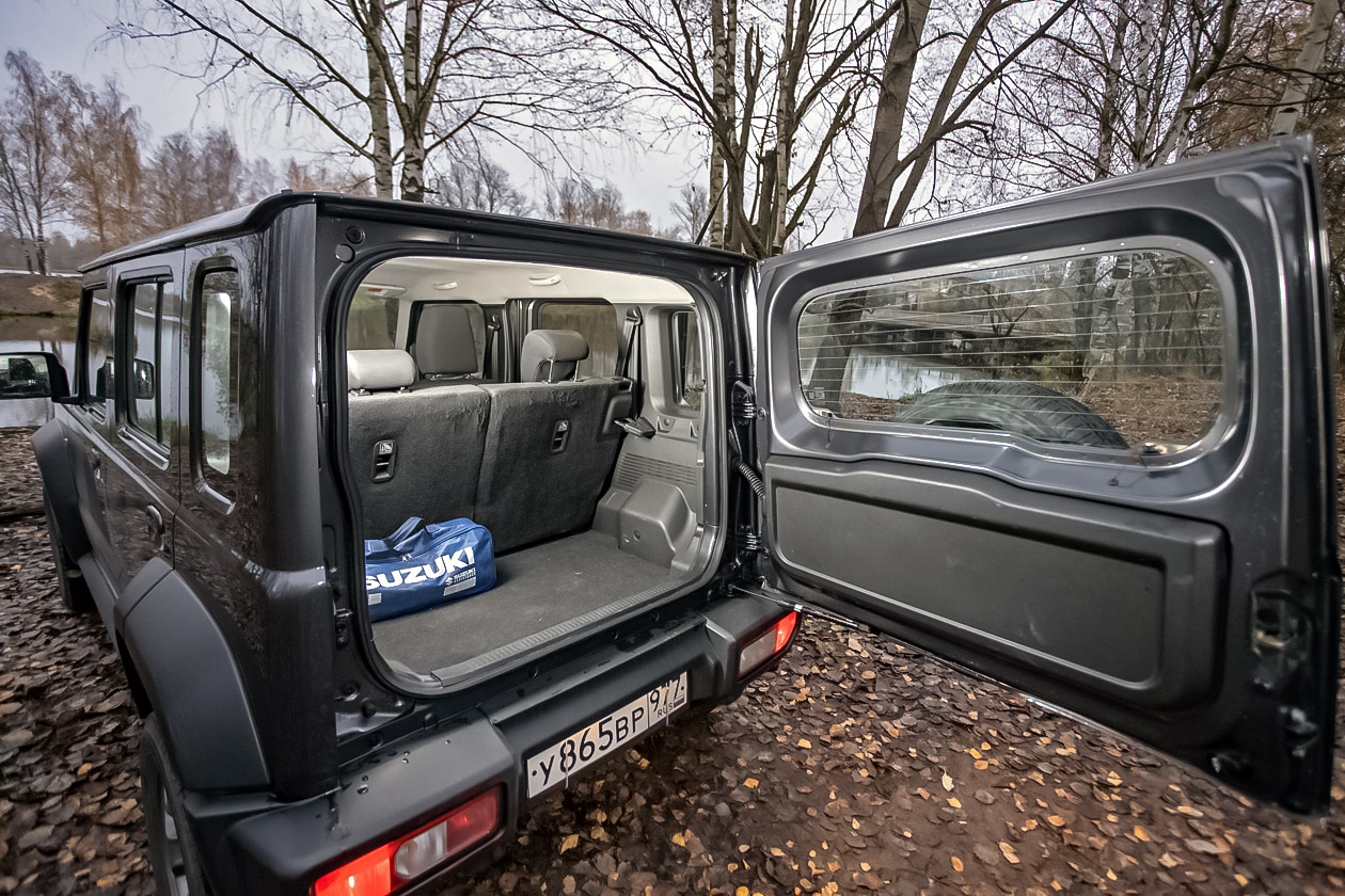 И это при том, что задние сиденья можно сложить в пропорции 50:50. Да, «ровного пола» не будет, да и в целом багажник от этого не станет даже среднестатистическим, но перевезти что‑то тяжелое и габаритное уже будет можно. В любом случае именно наличие багажника является главным преимуществом «пятидверки». Очень многие говорили еще про трехдверный «Джимни», что он был бы идеальным автомобилем для изучения красот отечественной природы. Вот только самые эффектные виды находятся вдалеке от обжитых кварталов мегаполиса, а затевать многодневное путешествие без минимального багажа было бы странно. Пятидверная версия решает эту проблему и превращает Jimny в полноценный автомобиль для длительных путешествий.