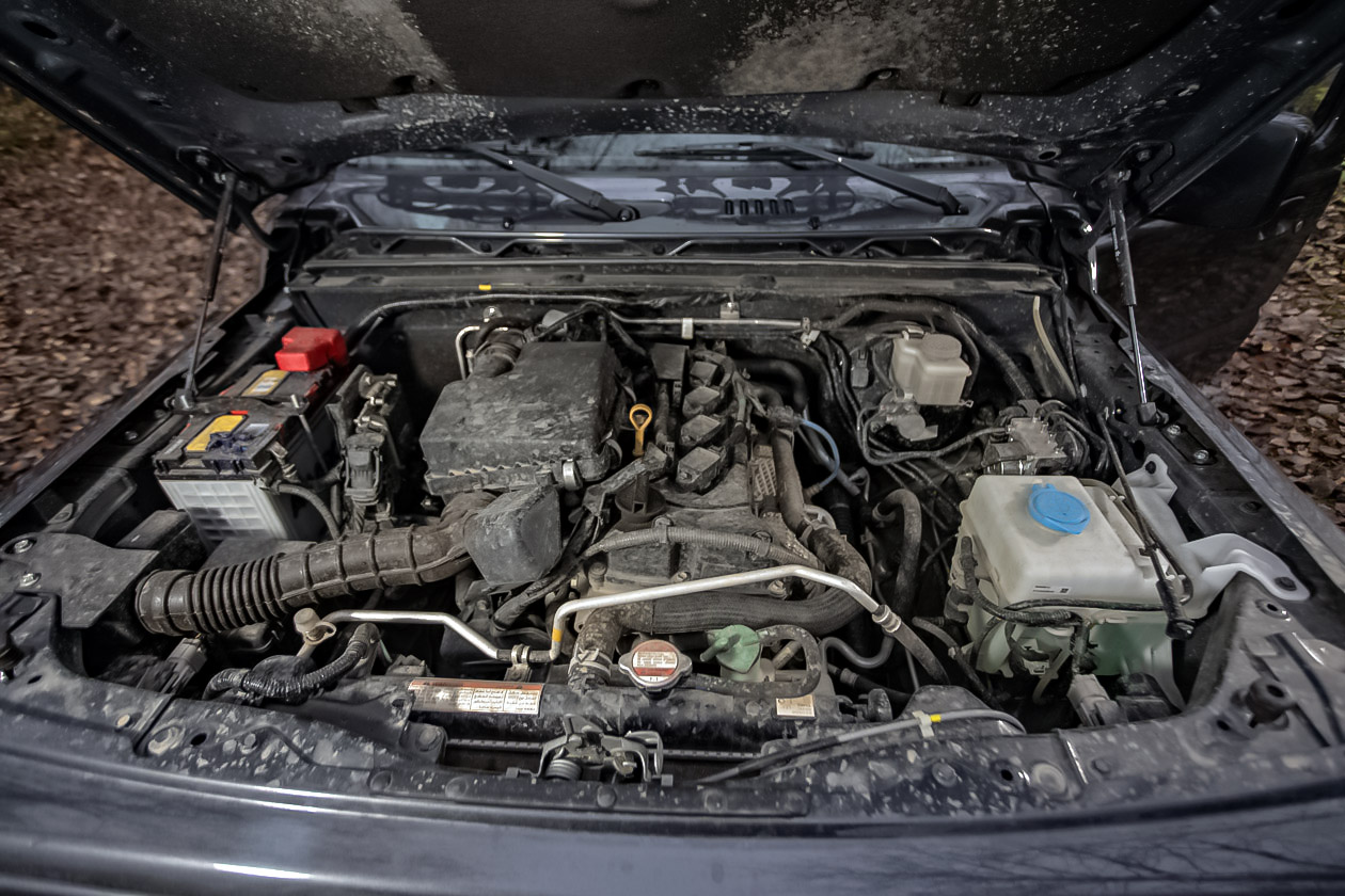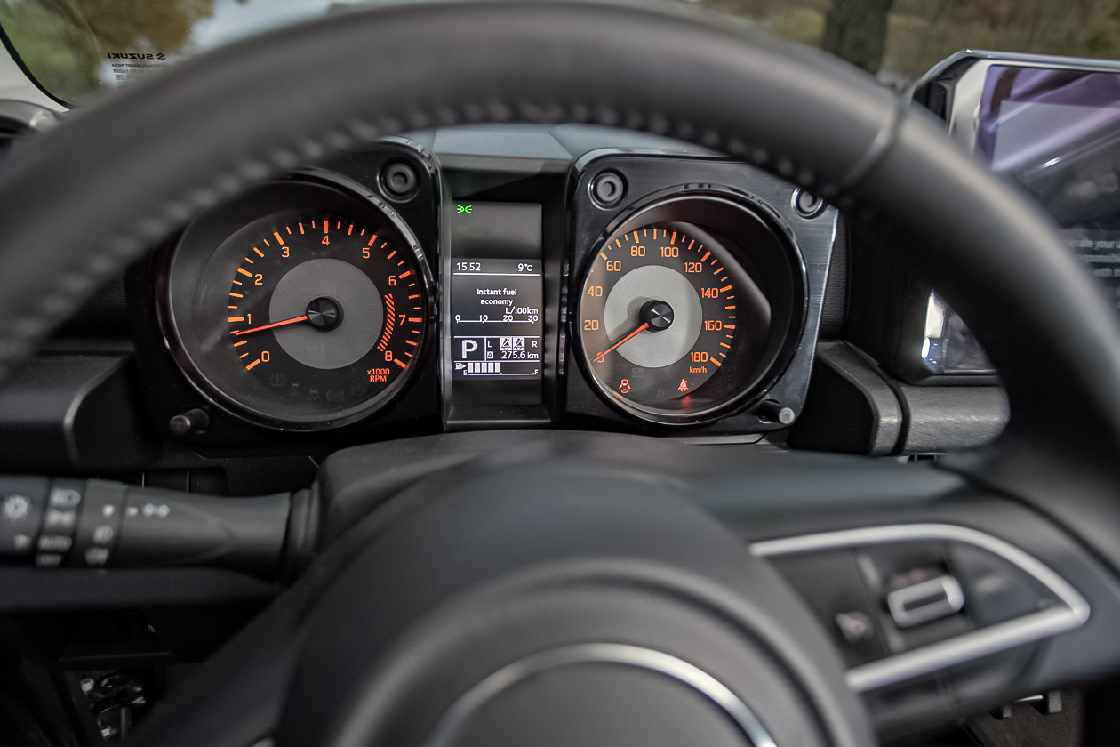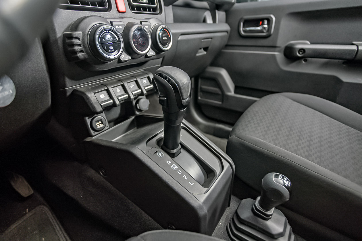 Под капотом изменений также нет: там расположился все тот же простой и немолодой 1,5‑литровый «атмосферник» на 105 л. с. и 134 Нм, который может работать в паре с 5‑ступенчатой «механикой» или с 4‑ступенчатым классическим «автоматом». Правда, найти среди привезенных моделей версию на «механике» непросто, в основном все имеющиеся на рынке машины — с АКП. И это расстраивает, потому что еще со времен первого тест-драйв Jimny я отметил для себя, как здорово было бы попробовать этот мотор именно с возможностью самому решать, когда переключаться. «Автомат», понятное дело, старый, и, возможно, с точки зрения работы на бездорожье это и более правильный вариант, но в городе взаимодействовать с ним тяжело: переключения не особо прогнозируемые, переходить на следующую ступень коробка зачастую просто отказывается, а никакого ручного режима не предусмотрено.