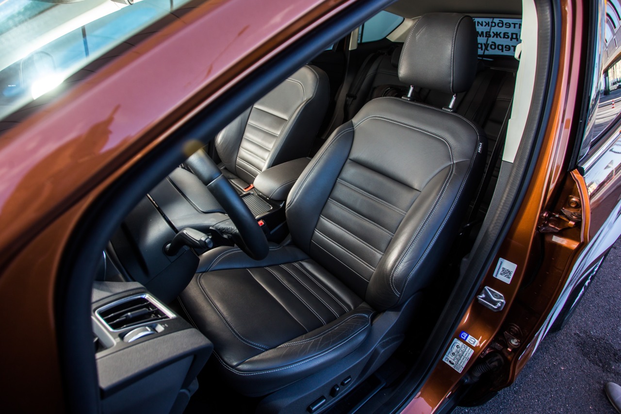 Футуристичное и геометрически сложное оформление салона Ford сыграло злую шутку не только с «Фокусом», но и с «Кугой» — передним седокам в машине субъективно тесно. Центральная космо-консоль буквально обволакивает по ногам и рукам, как кокпит спорткара, а не дарит простор и воздушность, как того требует семейная ориентация класса кроссоверов. Грешит Ford и недорогим пластиком оформления отдельных деталей. Впрочем, на эргономике и функциональности это никак не сказывается — в Kuga все под руками.