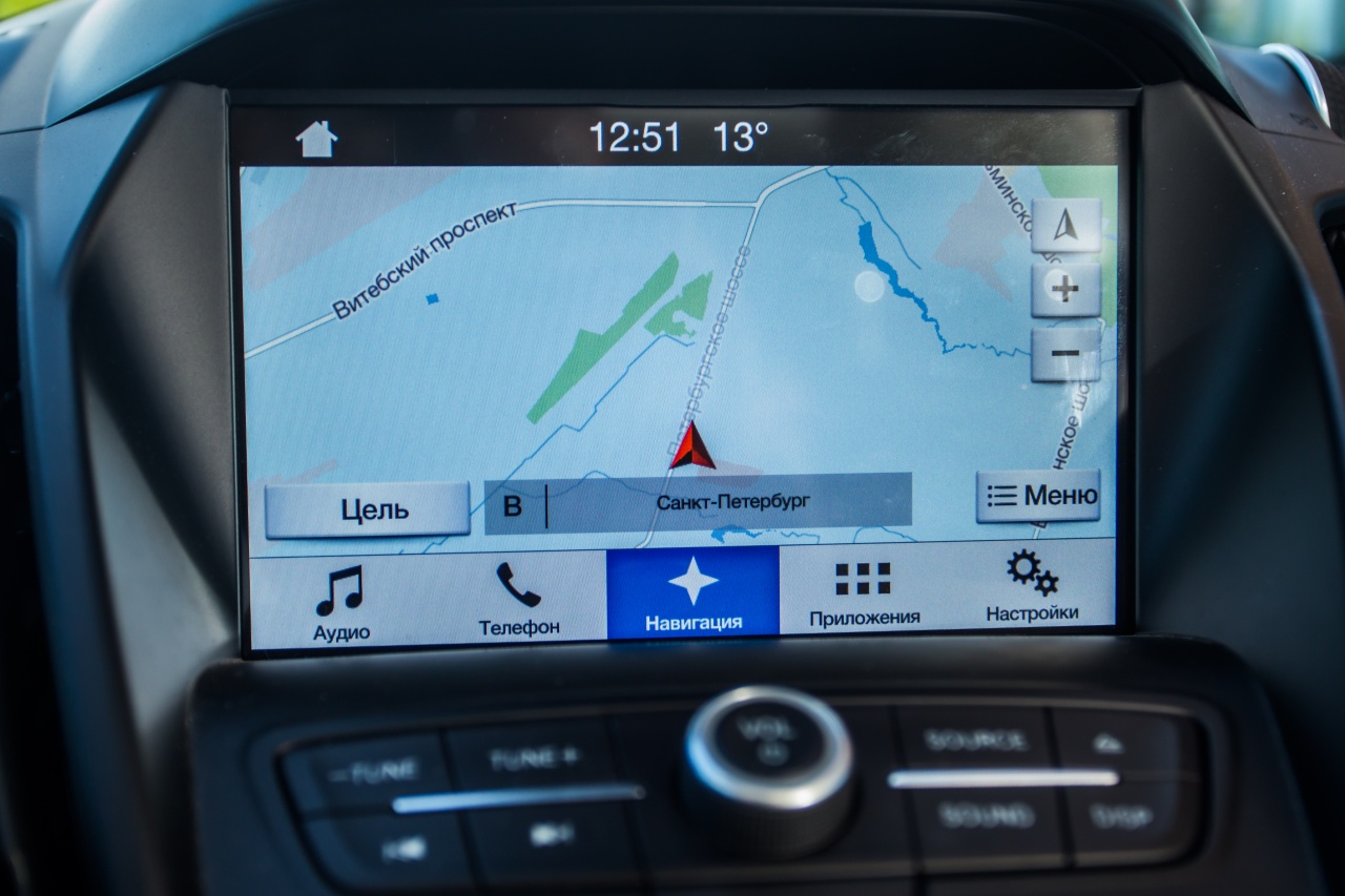 Системе Sync 3 в «Куге» добротно подыгрывают динамики Sony. Сама станция — тоже с полным функционалом и планшетным управлением. Навигация визуально похожа на карты СитиГИД и умеет отображать пробки через канал RDS