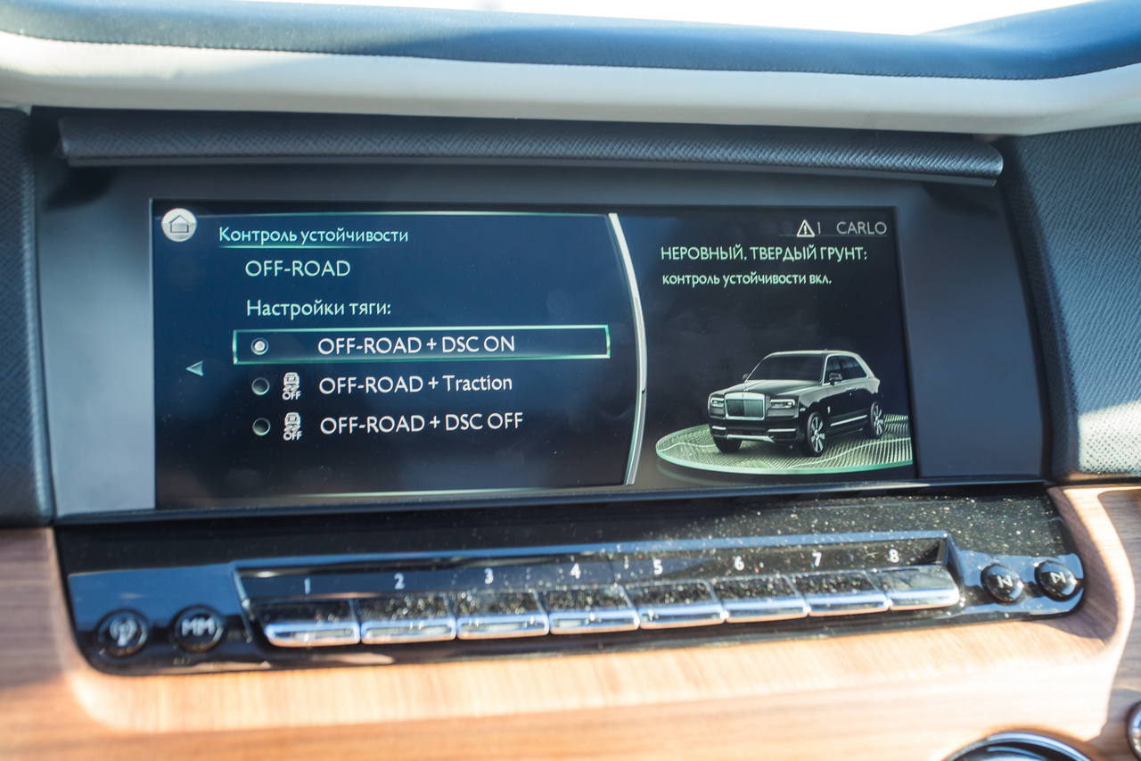 Для особых случаев перевести Cullinan в режим повышенной готовности можно и заранее кнопкой Off-Road, а также поднять кузов в предельный режим — с действительно джиперским клиренсом 240 мм.