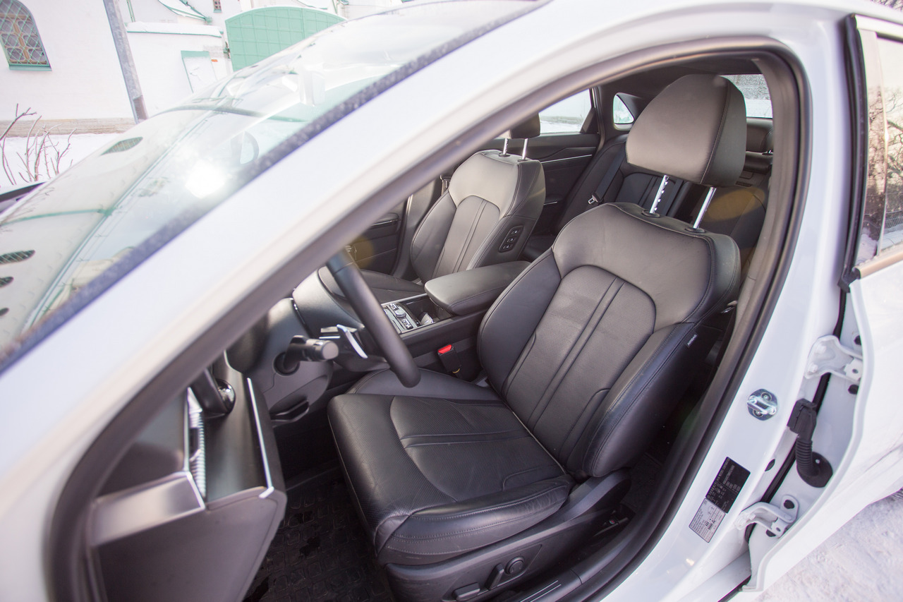 Передние кресла Kia K5 — с подогревом и вентиляцией, но с не самым выраженным профилем и скользкой кожей — в виражах держат не очень. Интересно, что правому пассажиру досталась опция от представительских персоналок — задний пассажир может при желании регулировать положение переднего сиденья. Второй ряд в целом комфортен: тут достаточно места, над головой для высоких пассажиров сделаны выемки, есть подстаканники, подогрев, индивидуальные USB-разъемы и дефлекторы обдува