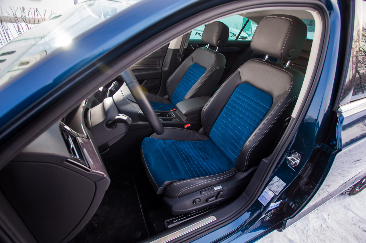 Несмотря на то что топовый Volkswagen Passat уступает Kia в оснащении, пересаживаешься в него как в машину более высокого класса. И создается это ощущение именно благодаря качеству отделки и спокойному сбалансированному подбору фактур. Достаточно потрогать интерьерную кожу, чтобы понять, какая машина дороже. Даже карманы в дверях у Volkswagen отделаны мягким ворсом. Если K5 — это автомобиль визуала, то «Пассат» — однозначно кинестетика. Хотя свой шарм есть и у «немца» с его натянутыми через всю панель «струнами» и контурной подсветкой. Выбивается из строгого стиля только вычурная синяя отделка кресел, идущая опционально в дополнение к необычному цвету кузова.