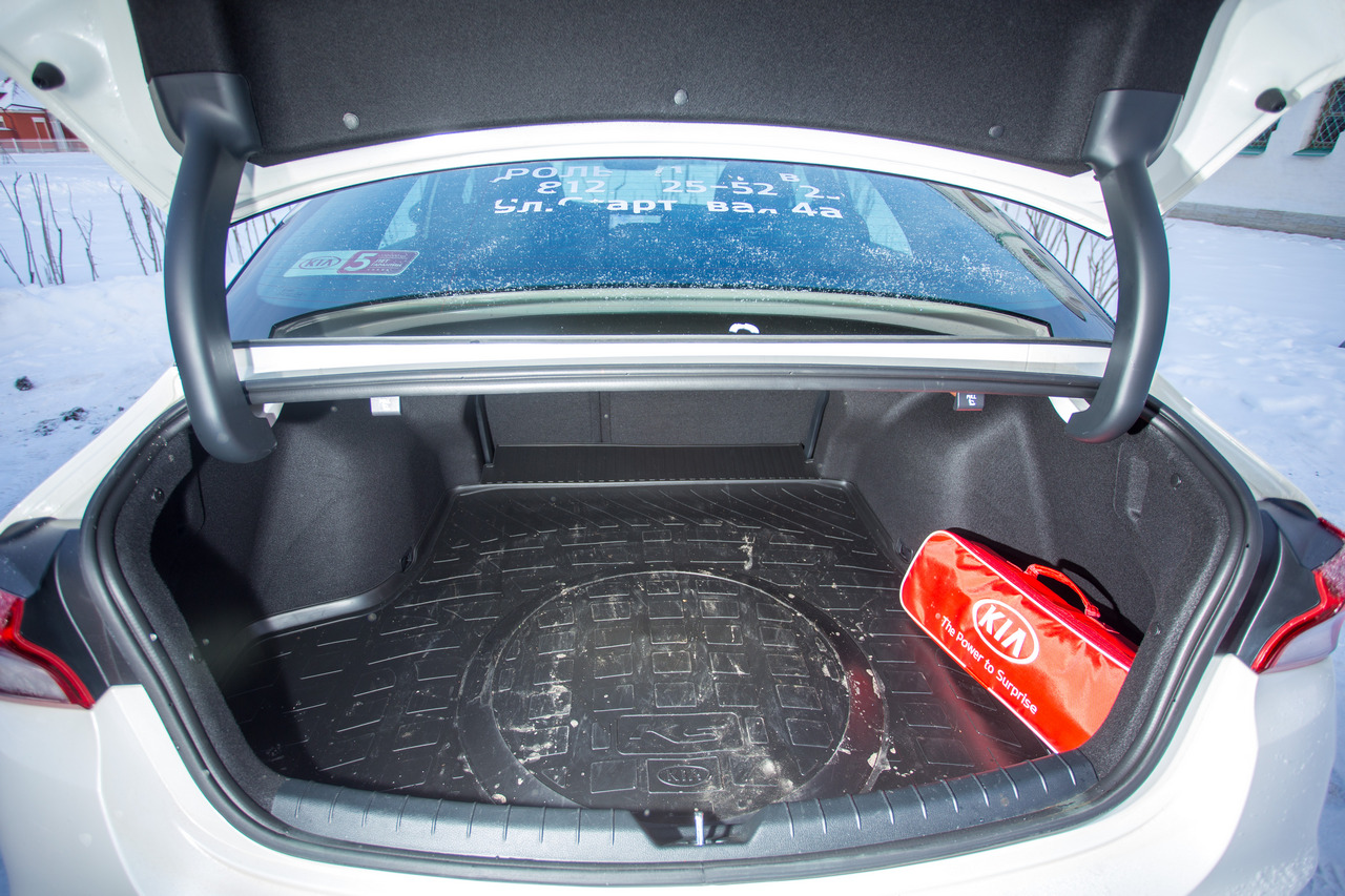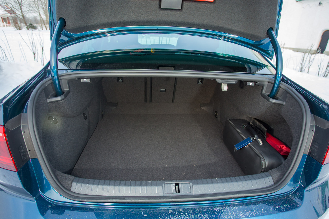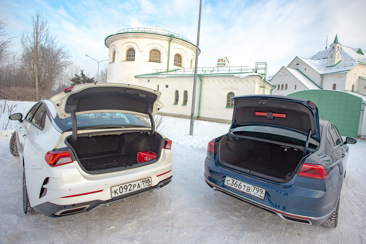 Багажник по всем параметрам лучше у Passat. Во-первых, он на 76 литров больше (586 литров против 510 у Kia), во-вторых, удобнее отформован и, в-третьих, чуть более функционален за счет трасформации. При этом Volkswagen имеет электропривод, а вот крышку Kia приходится закрывать ручками. Запасные колеса в обоих автомобилях полноценные, но в K5 запаска чуть-чуть не влезла — корейцам пришлось делать горб