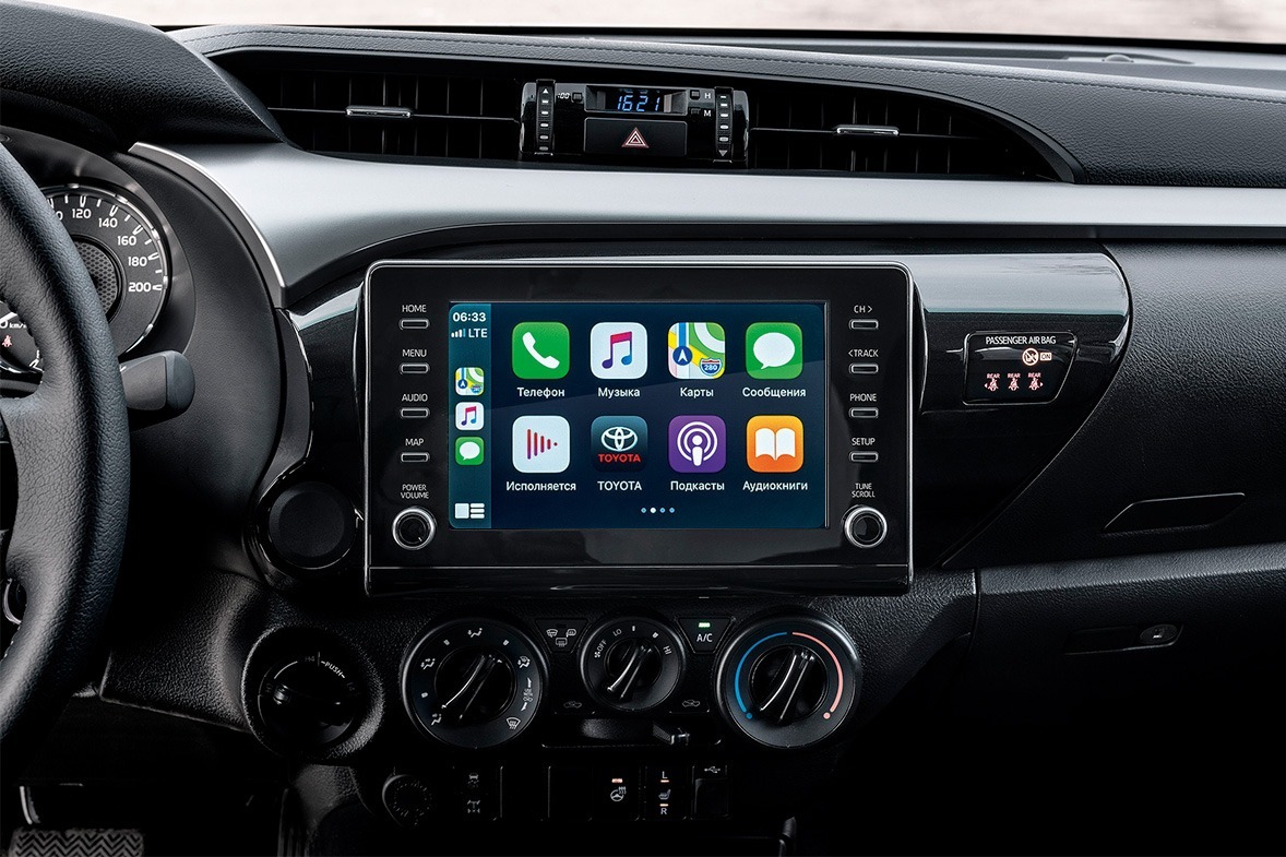 Внутри обновленный Hilux отличается от предшественника модернизированной приборной панелью с цветным экраном диагональю 4,2 дюйма, список оснащения в исполнении «Комфорт» пополнился мультимедийной системой с 8-дюймовым экраном, поддержкой Apple CarPlay и Android Auto, голосовым управлением и возможностью воспроизводить файлы со смартфона и внешних источников.