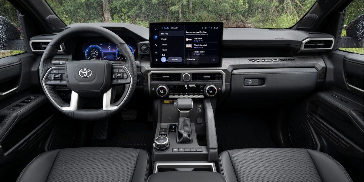 Салон новой Tacoma выполнен в стилистике «Тундры». В дорогих версиях на передней панели установлен 14-дюймовый сенсорный экран мультимедийной системы с беспроводными интерфейсами Android Auto и Apple CarPlay, цифровая 12,3-дюймовая приборка (в простых комплектациях будут дисплеи диагональю 8 и 7 дюймов соответственно), штатно предусмотрен бесключевой доступ и запуск двигателя с кнопки, а также полный набор ассистентов водителя Toyota Safety Sense 3.0.