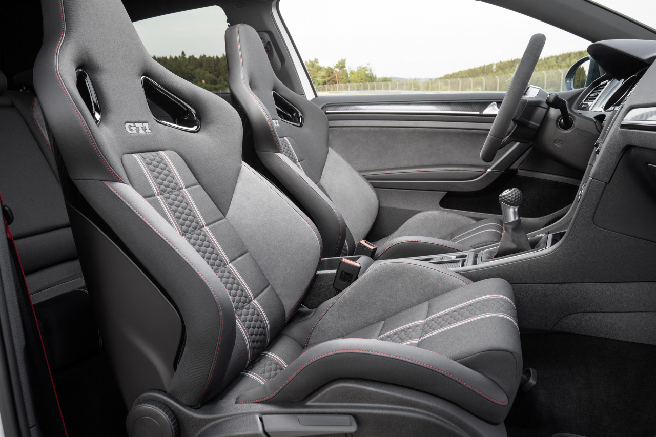 Салон Golf GTI Clubsport с точки зрения дизайна не изменился. Автомобиль лишь получил гоночные сиденья, руль и рычаг КПП, отделанные алькантарой. Чуть иными стали декоративные вставки в дверях и передней панели.