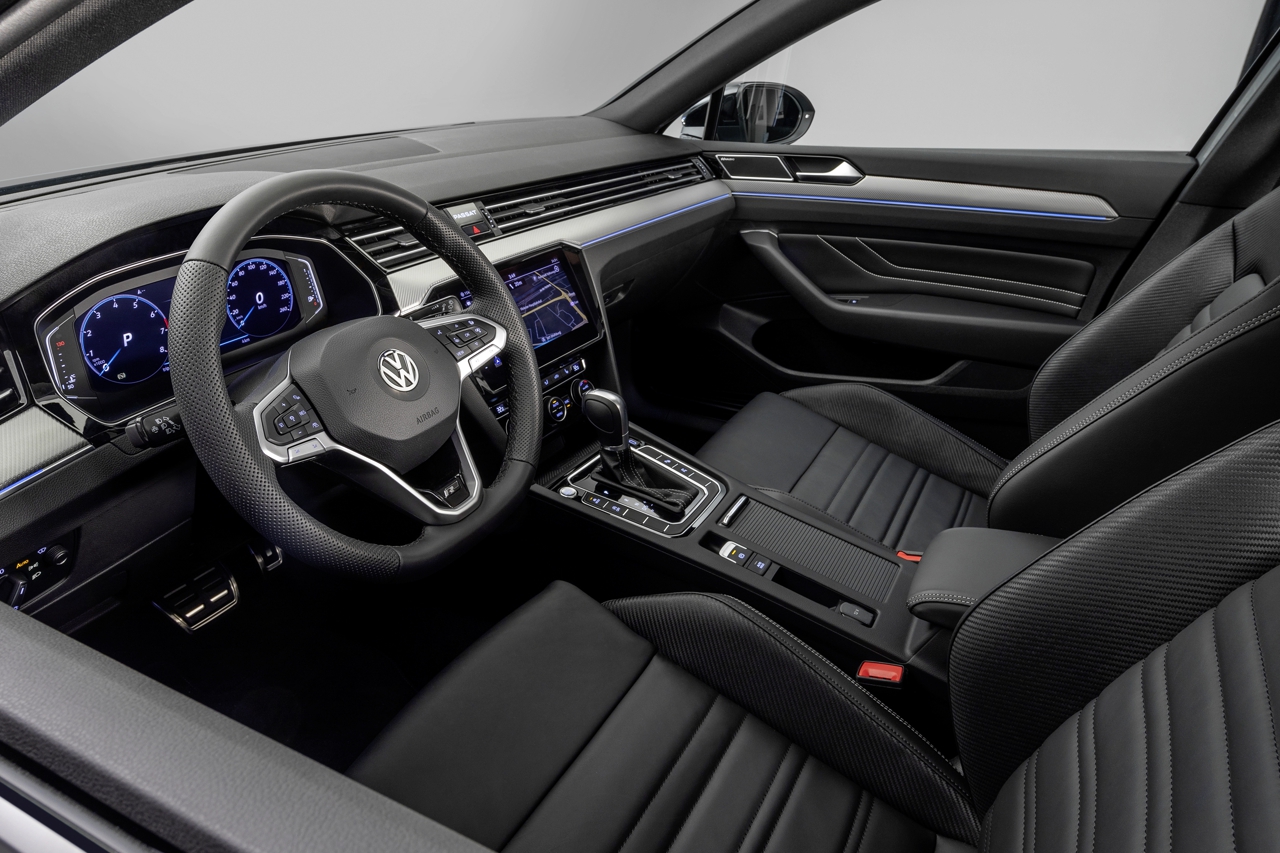Черный цвет также доминирует в интерьере нового Passat. Новинка получила спортивные сиденья R-Line, центральные панели сидений обтянуты кожей наппа, а боковые подушки — карбоновой кожей.