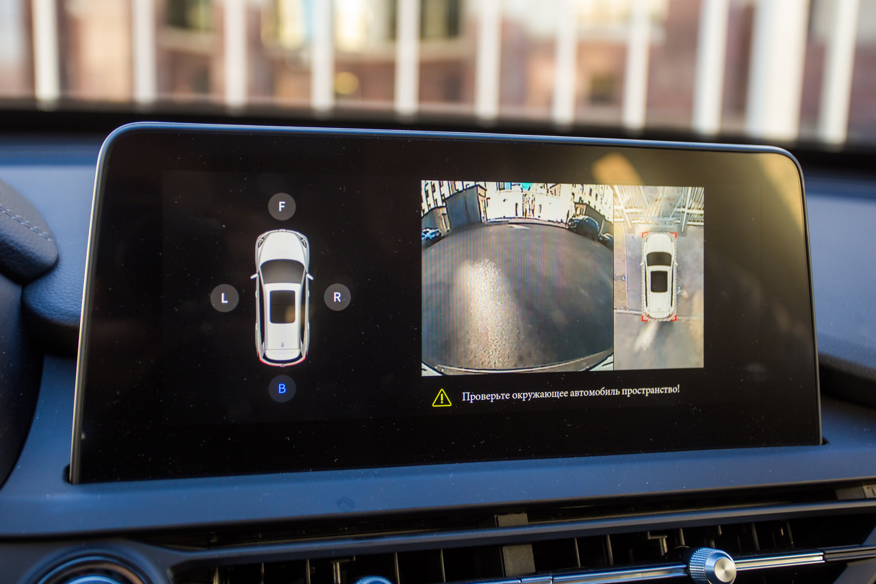 Центральный дисплей, сделанный по последней моде в виде сенсорной трапеции, графическим оформлением не поражает и лишен навигации. В остальном — стандартный набор опций, включая круговой обзор камер с трехмерной проекцией