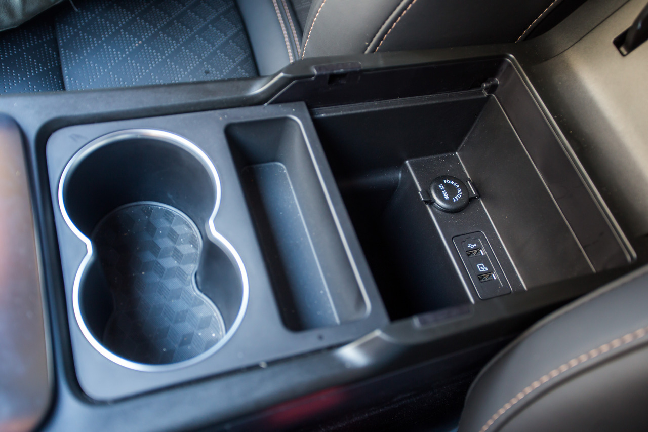 Передние кресла с электроприводом имеют нейтральный профиль, подходящий большинству водителей. Между сиденьями — функциональный охлаждаемый бокс с розетками и возможностью зонирования пространства.