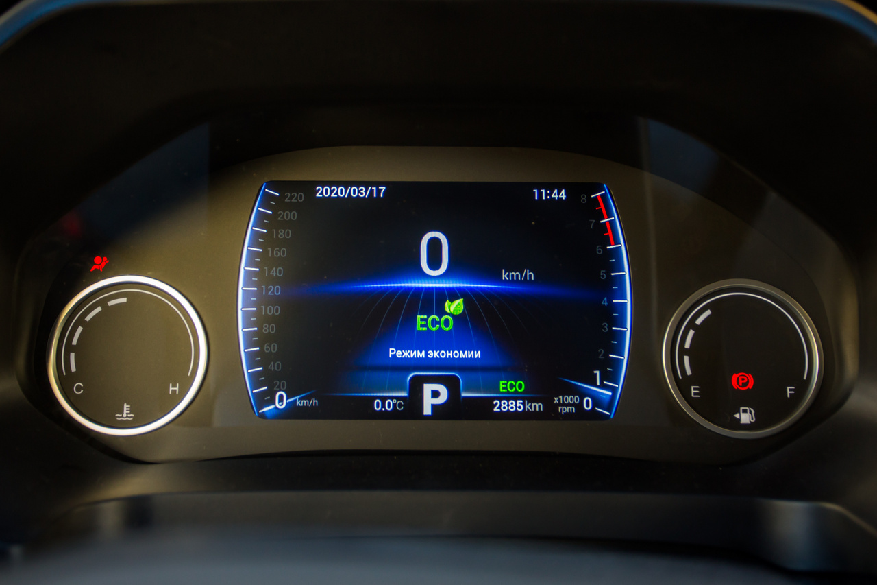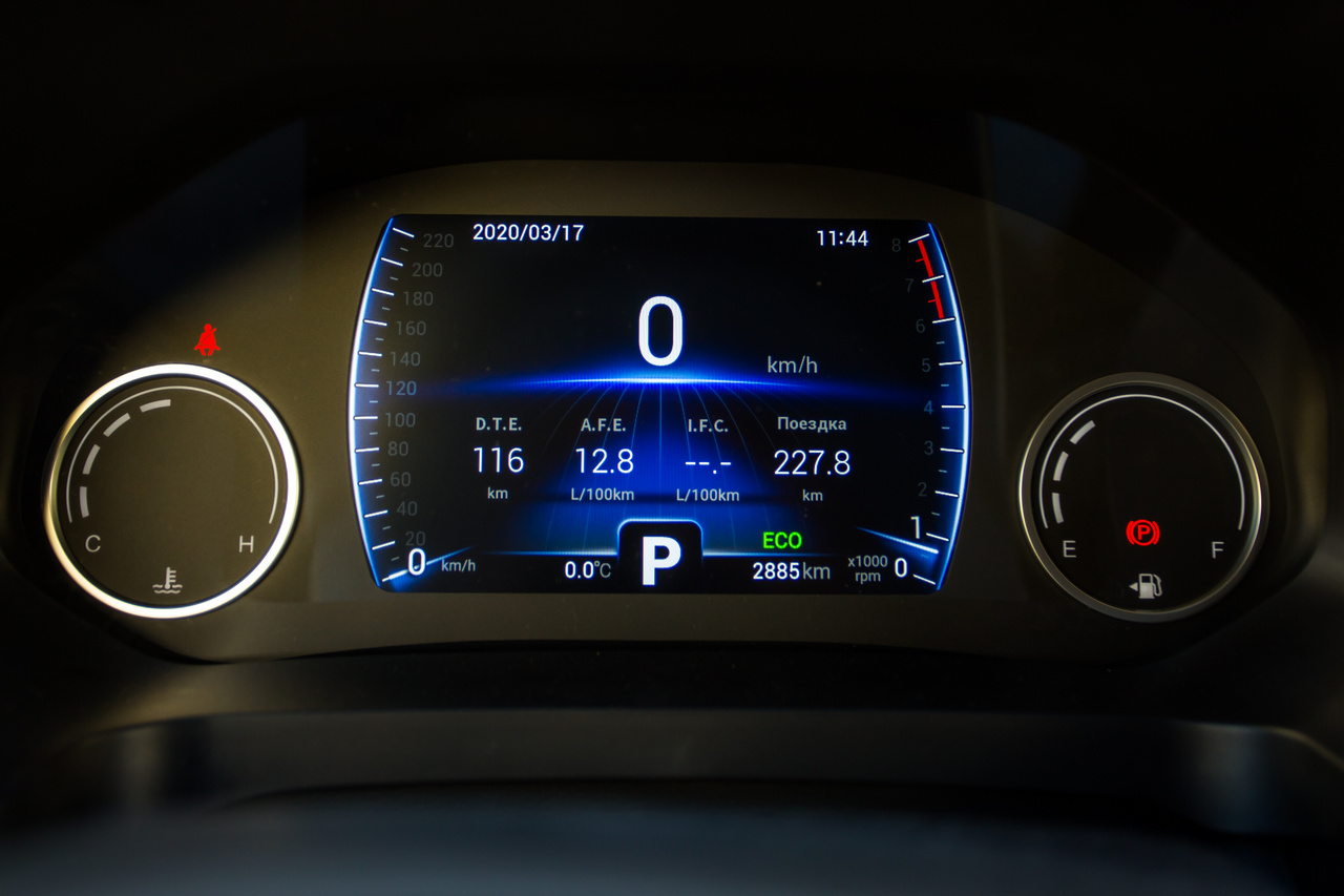 Нюансы открываются со временем, и все они касаются эргономических недоделок. Аналоговое управление магнитолой в виде тумблерных кнопок — не самое удобное решение. Щиток приборов с большим и ярким 12,3-дюймовым экраном больше наряден, нежели информативен. Кроме того, перевели его наполовину — и то криво: «языков — русский», «тема — синий». Вместо запаса хода, среднего и мгновенного расхода топлива — непонятные шифры D.T.E, A.F.E и т. д. Кругляшки по бокам с тонюсенькими секторами топлива и температуры двигателя сделаны так, как будто создатели просто занимали ими место.